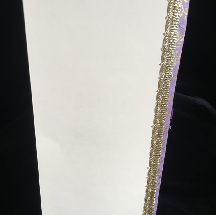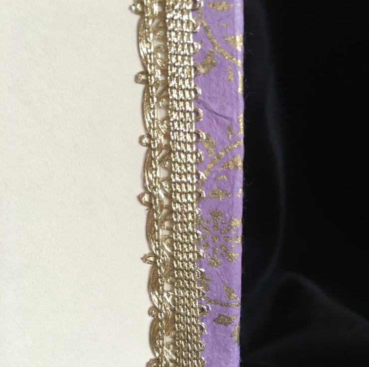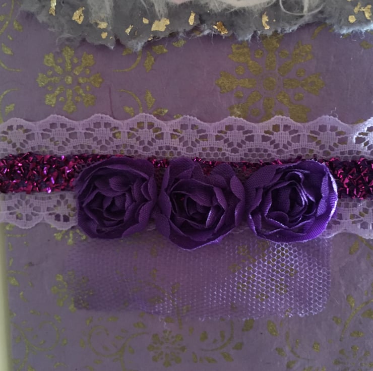 Across the middle there is lilac lace topped with a pinky/purple glitter ribbon and 3 purple flowers