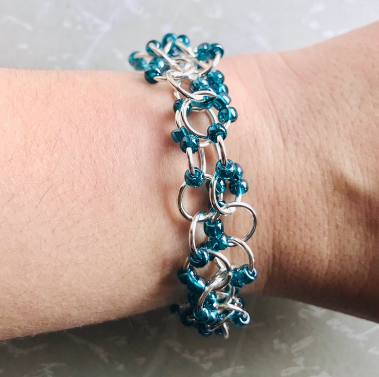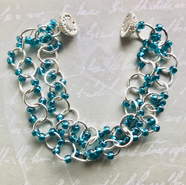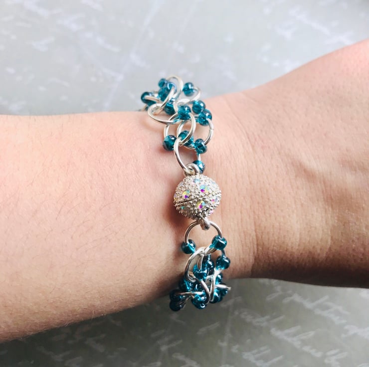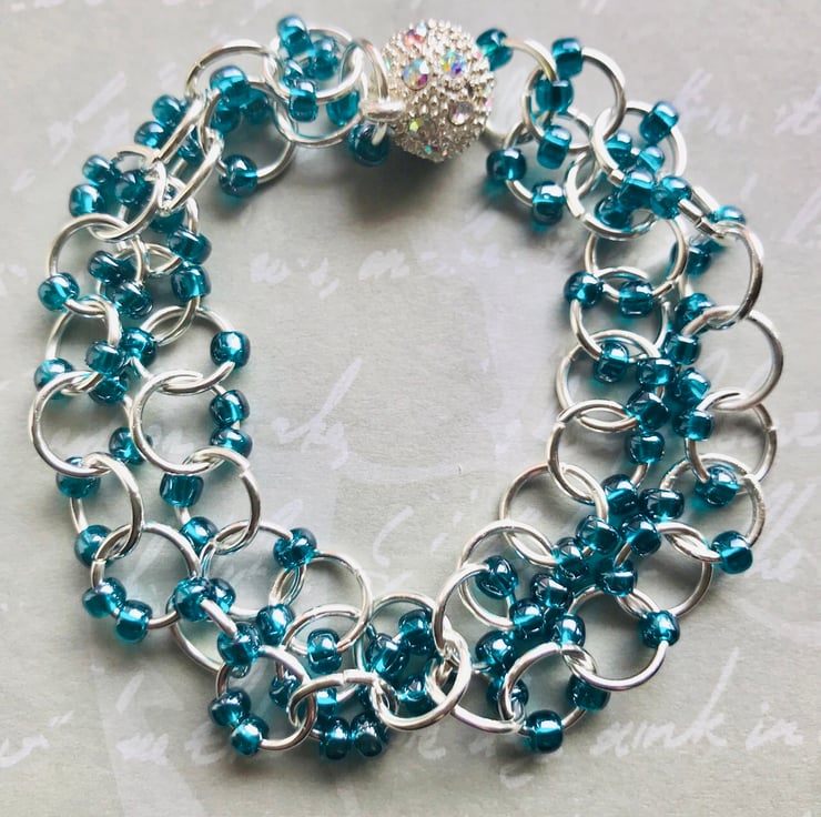 Beaded link bracelet. Handmade chain with Capri trans teal, shiny seed beads. Fastens with a rhinestone encrusted, magnetic ball clasp. Measures approx 20.5cms.