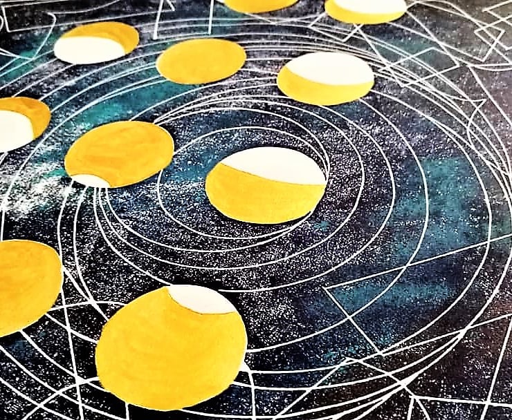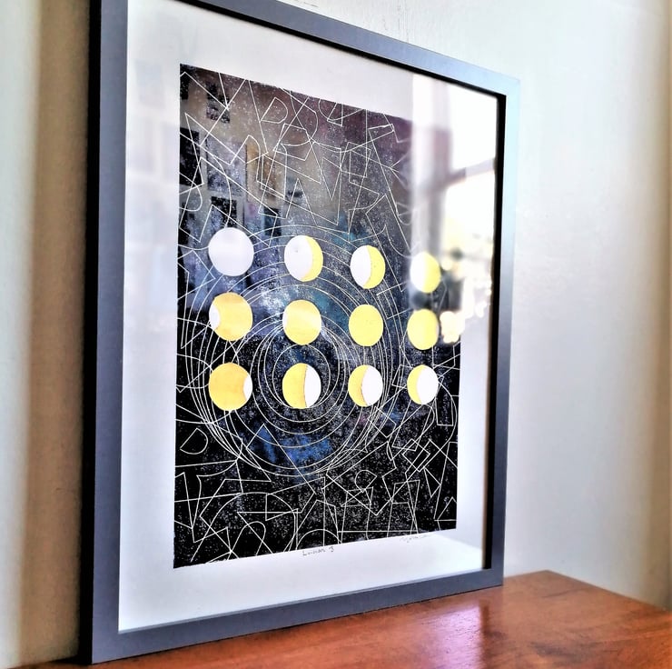This is my third linoprint based on a moon (Lunar) theme. The ever changing lunar phase are projected against a dark universe, expanding with a flash of turquoise light. Circular trajectories representing the paths of planets, merge into the floating letters that surround them. The whole printing process is done by hand so that each print has its own unique textures and character. The lunar phase was painted by hand for luminosity.