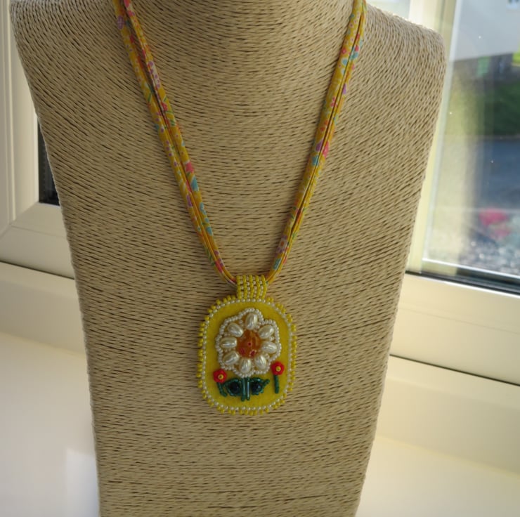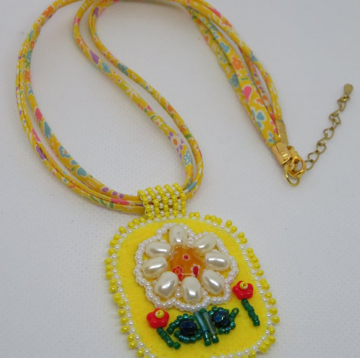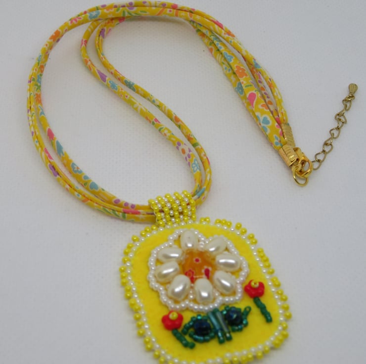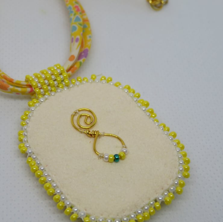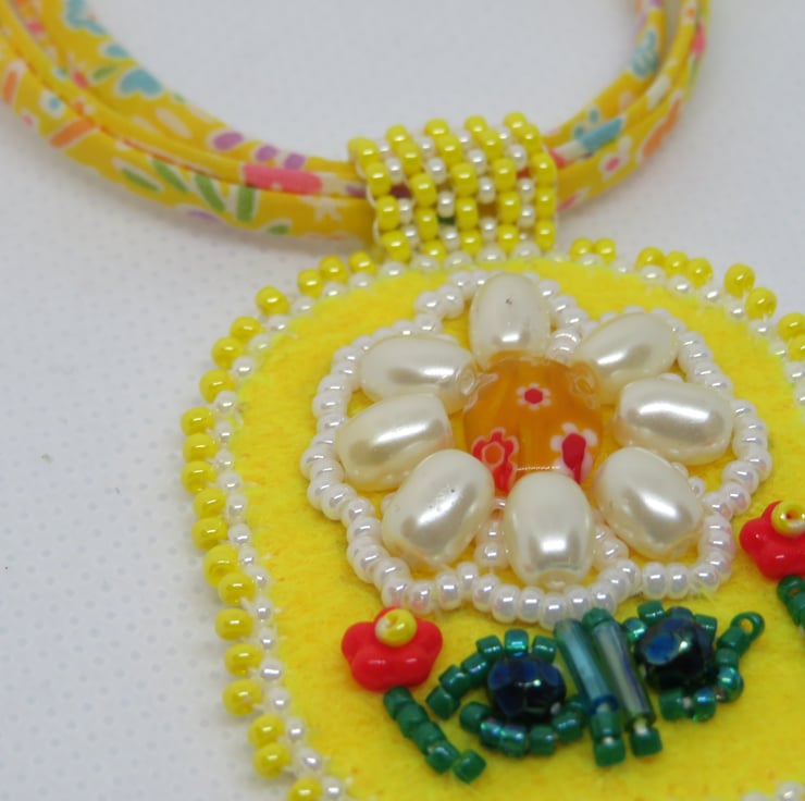 Beautiful oval glass pearls, seed beads and a central millefiori bead make up the main feature in this bright and cheerful bead embroidered pendant on a yellow background. Supported on a stem of green bugle beads and delicas and bead embroidered leaves featuring fire polished crystals. Little red flowers made from daisy spacers complete this little garden of delight. The pendant has a hand beaded bail and a double strand of liberty print cotton cord with gold plated fittings and trigger clasp. The pendant is backed with cream ultrasuede and is finished with my spiral symbol in gold plated copper wire.