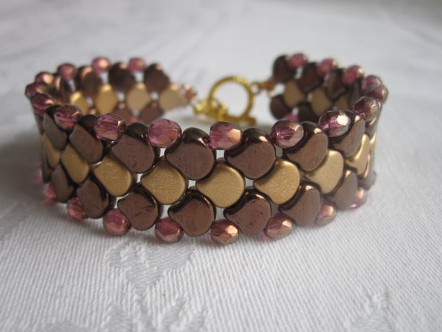 A beadwork bracelet made with gold and bronze Czech ginko beads, rose gold Czech fire polished glass beads and Japanese seed beads. The bracelet measure approx 18.5 cm end to end including the clasp and the main body around 15.7 cm. The bracelet is finished off with a gold plated toggle clasp. This item comes in an organza bag. Gift boxed options available at check out.