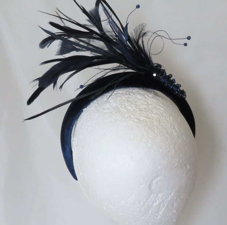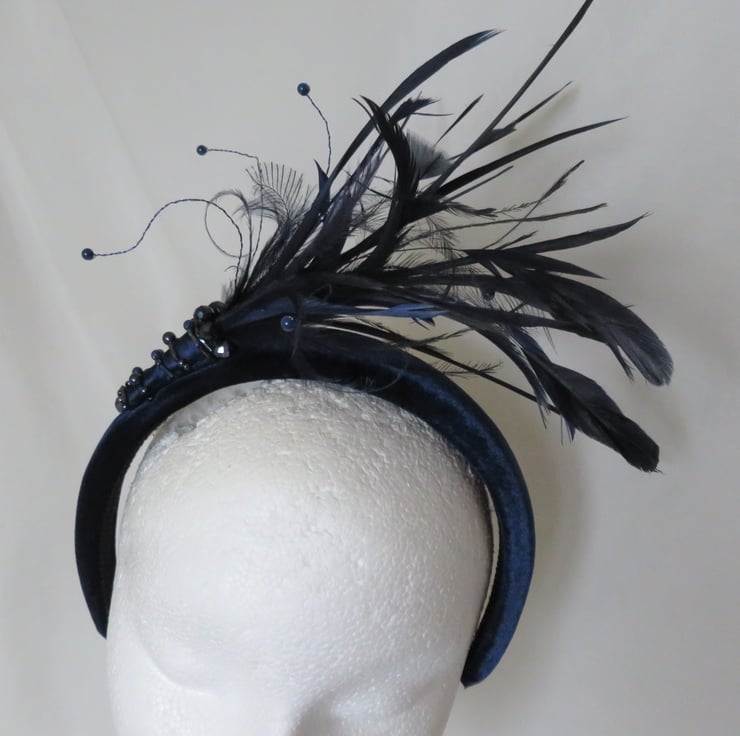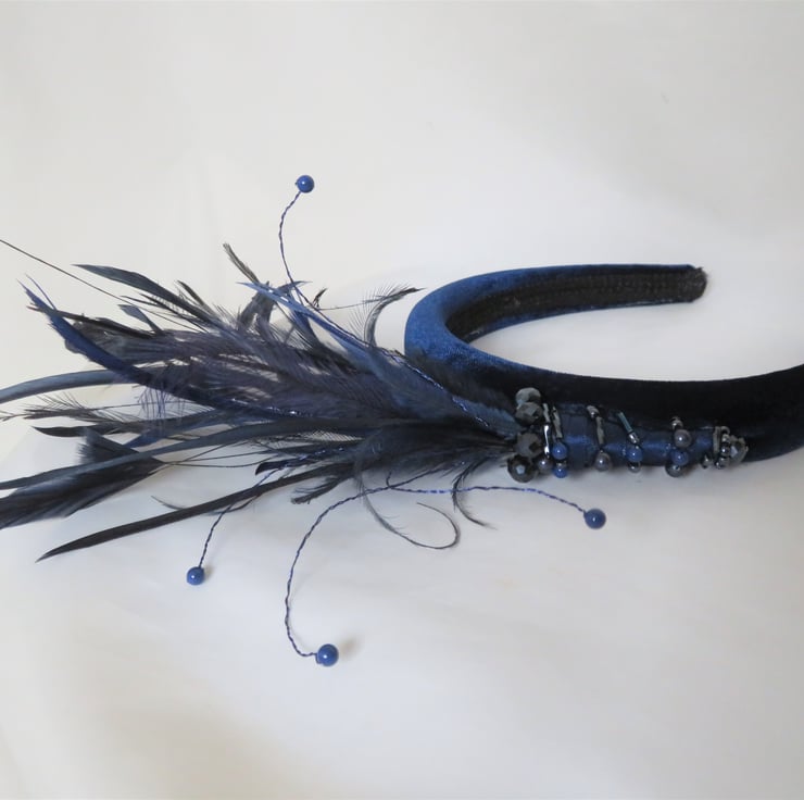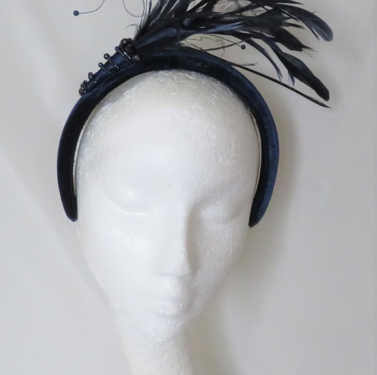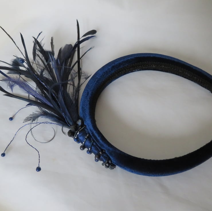 Created with a lovely marine navy blue velvet covered padded headband, finished with black braid underneath.