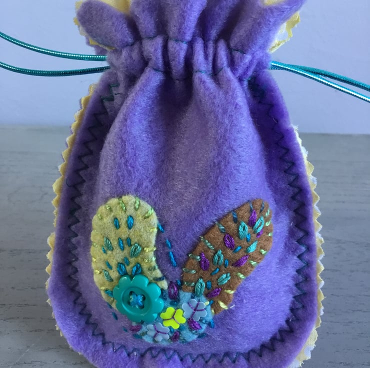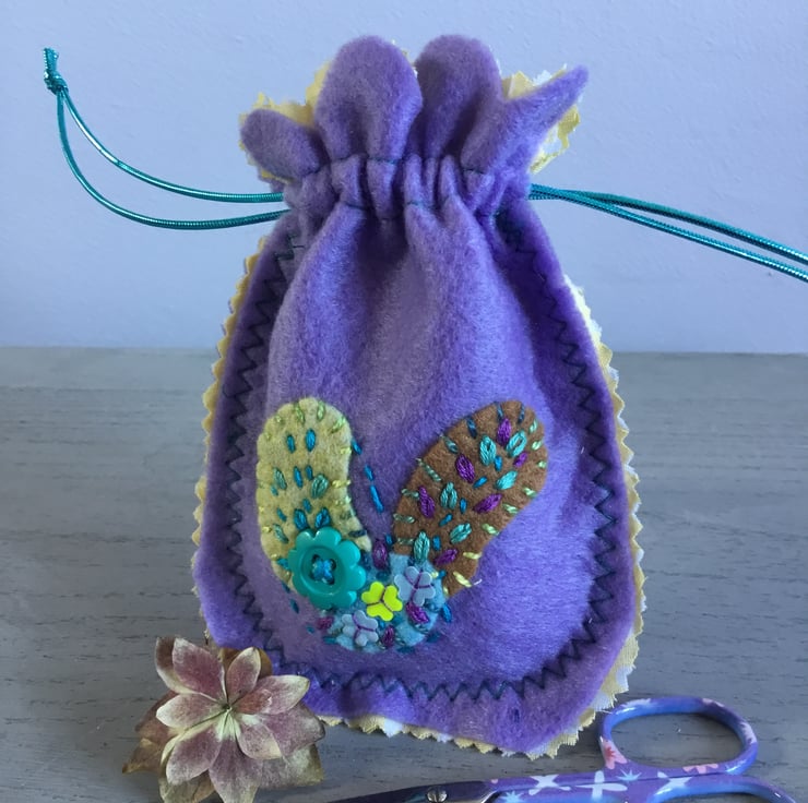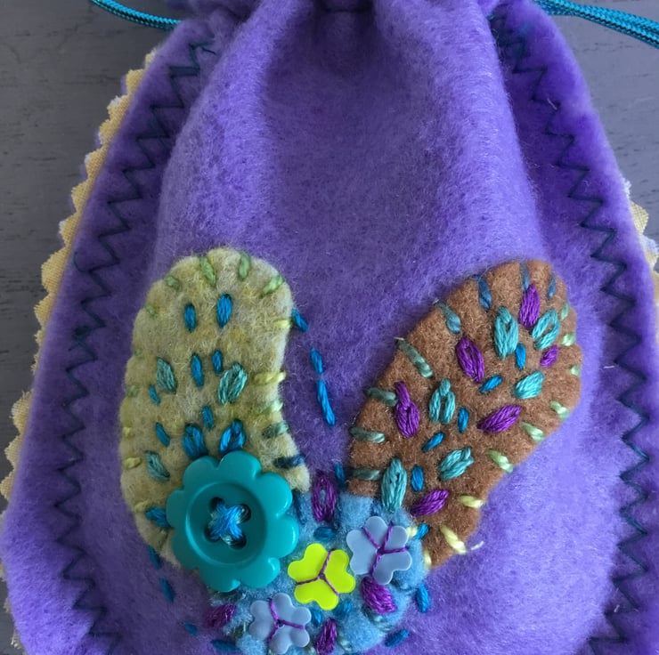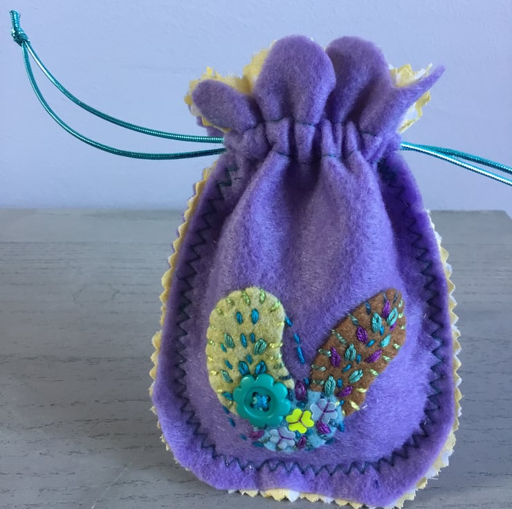 This Hand Embroidered Lavender Felt Bag is a nice useful size 6 by 4 inches (15 x 10 cms). A bag with so many uses ........ to wrap a gift or, use as a jewellery bag, a travel bag...so many uses. An eco friendly bag that can be used again and again....in a reusable way....with zero waste….