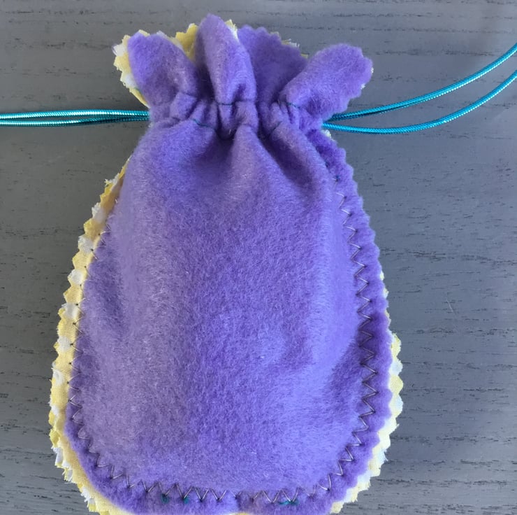 This Hand Embroidered Lavender Felt Bag is a lovely lavender colour, lined with yellow polka dot cotton fabric with a turquoise drawstring cord. The bag is embroidered with Lazy-Daisy, Running and Straight Stitches, hand embroidered around a turquoise flower button on yellow, brown and blue felt, dotted with flower shaped sequins.