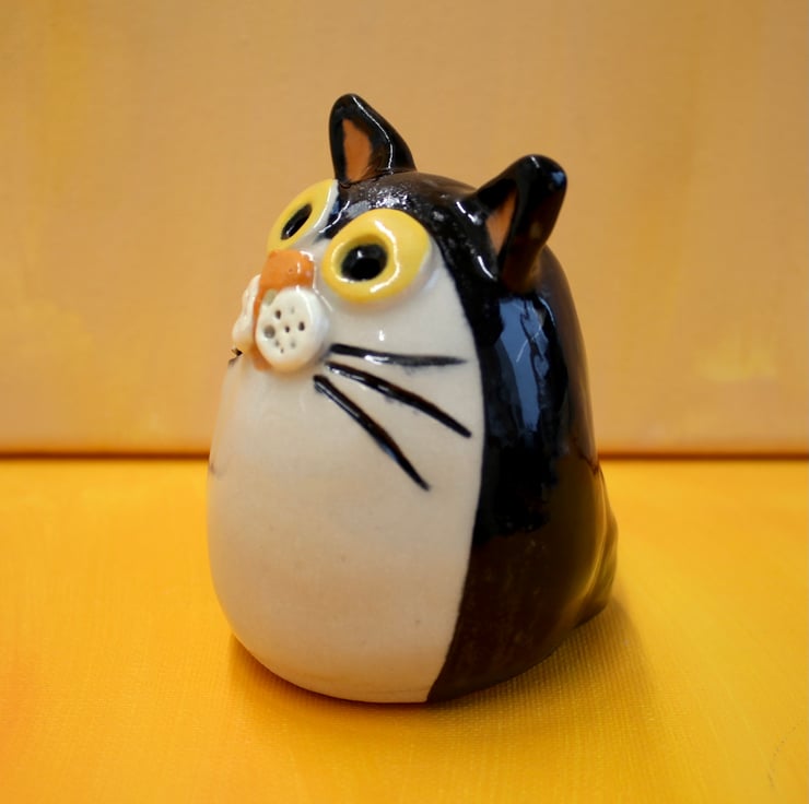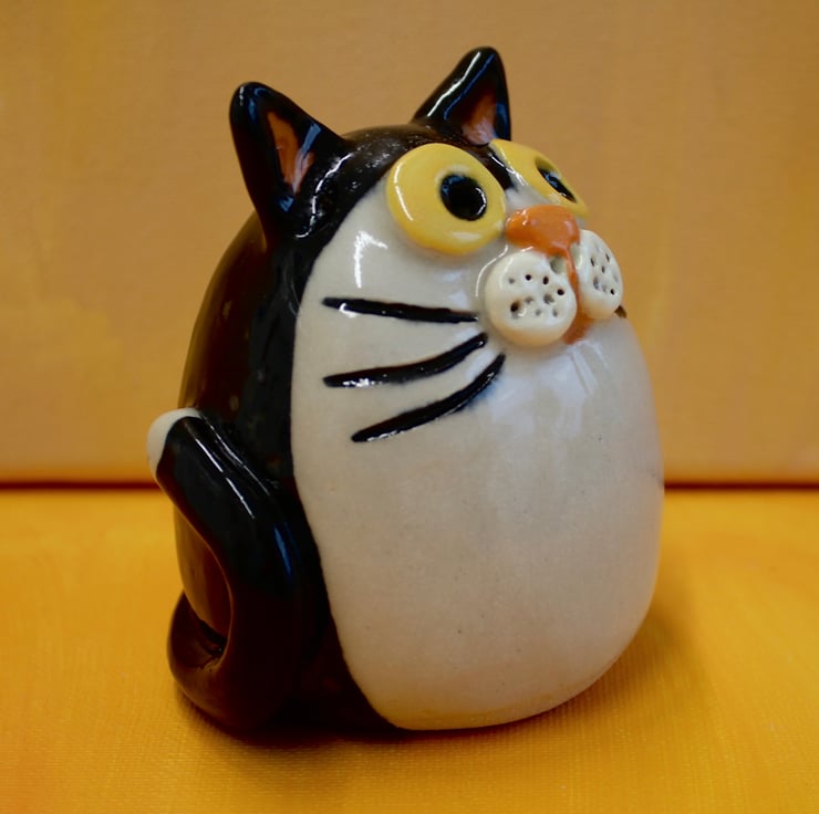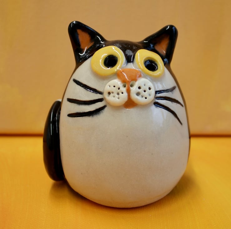 This cute stoneware cat is hollow and shaped from white clay which has been biscuit fired to 950 degrees in the kiln at the bottom of my garden!