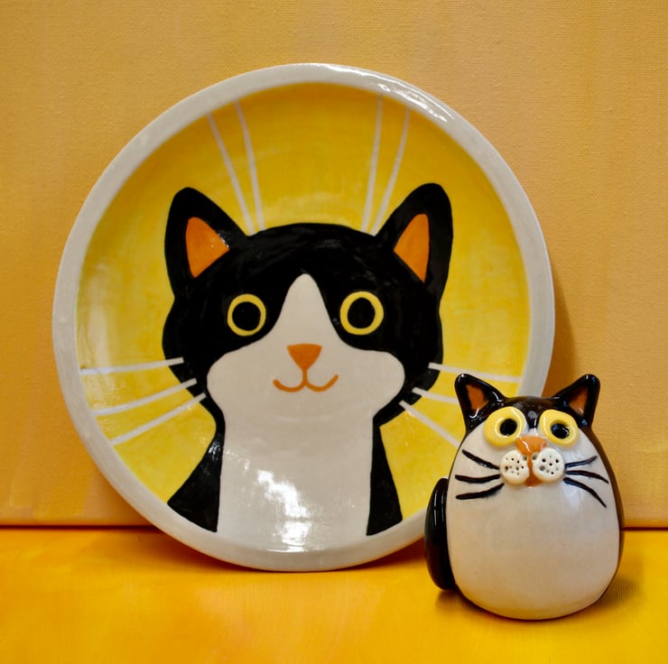Once cooled I painted the ornament with underglazes and finished off with a transparent shiny glaze. Fat Cat is heavy! Great for a paperweight or just as an ornament. He's equally happy indoors or out and measures approx. 9cm tall. He does look rather fine with the cat plate that I made. Both designs are based on my linocut 'Happy Cat'-you can see that from the final photo.