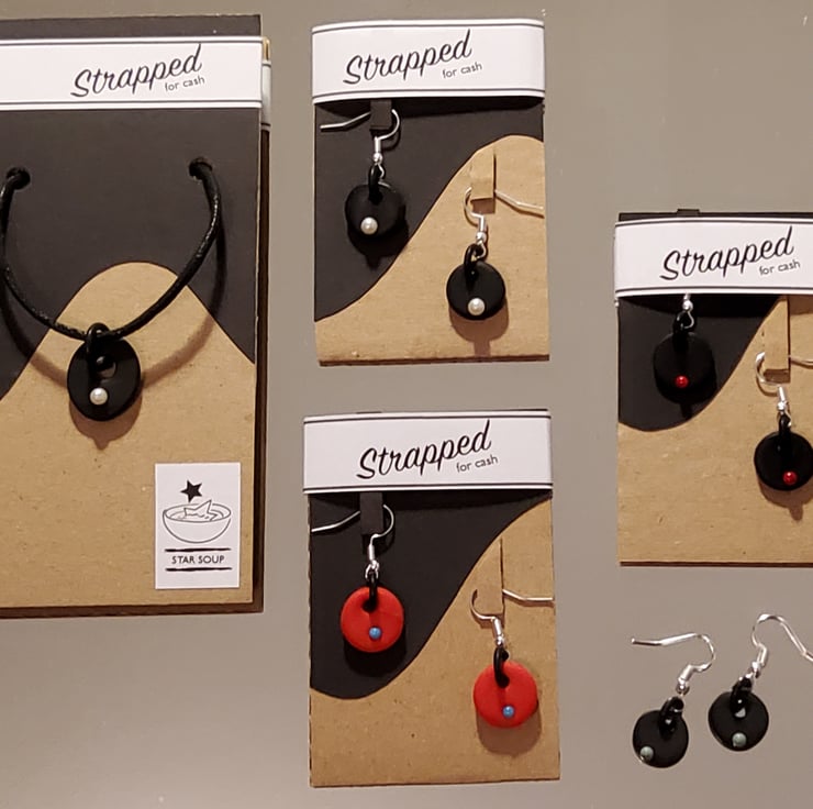 You've heard of Bo Jangles, well this is No Jangles! Rubber links instead of ever having to put up with metal on metal. Strapped for Cash is a range of jewellery using boingy and comforting fixtures and fittings for when life needs to FEEL good as well as Look good. The earring discs are 15mm diameter. You can buy what's here or email Star Soup to ask for a different background colour and glass sphere colour. You may like to order a necklace to match your choice of earrings. The magnetic clasp is chunky and strong; No Jangles!