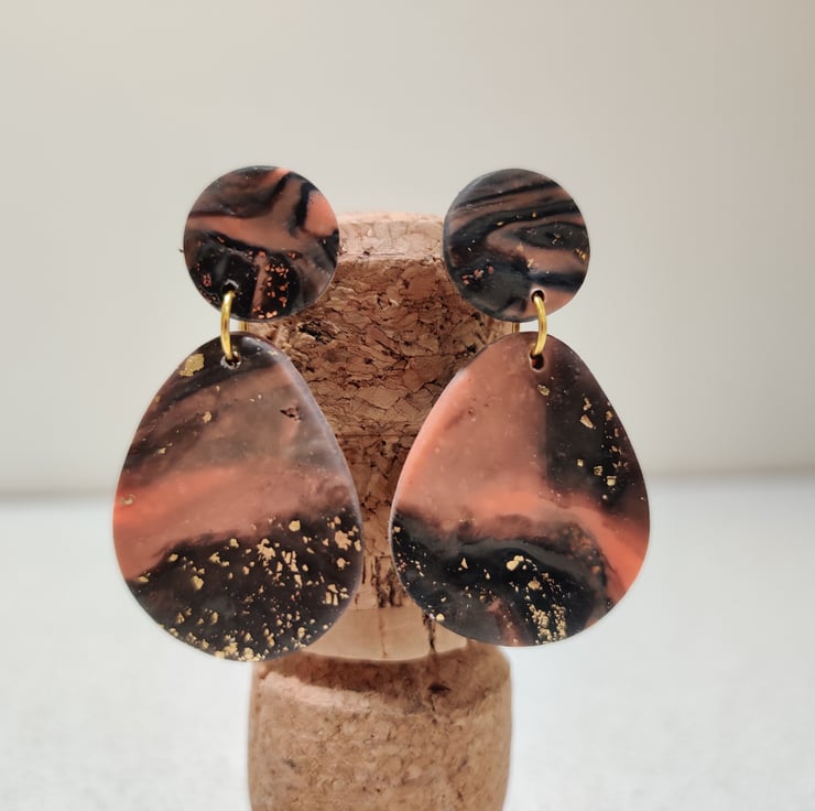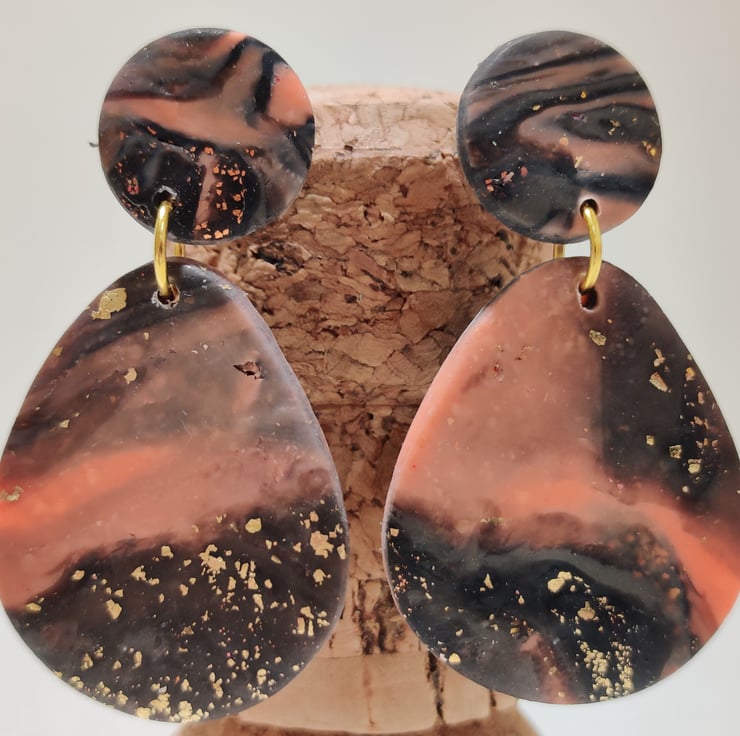 Hand made polymer clay earrings, with an abstract peach black and gold flake pattern. Stud fixing which can be painted with hypoallergenic coating for free on request. see all photos for close up detail. All products handmade therefore there may be minor imperfections. Each pair sold as seen, message for more info