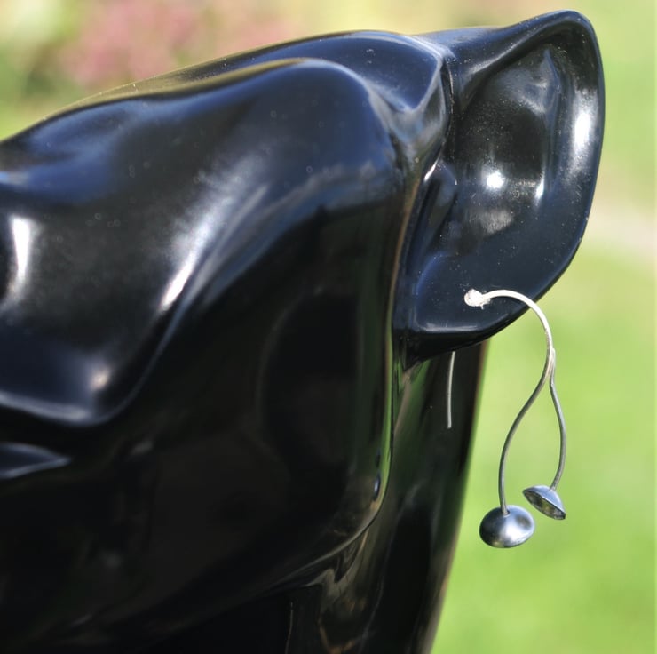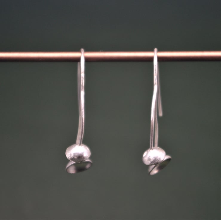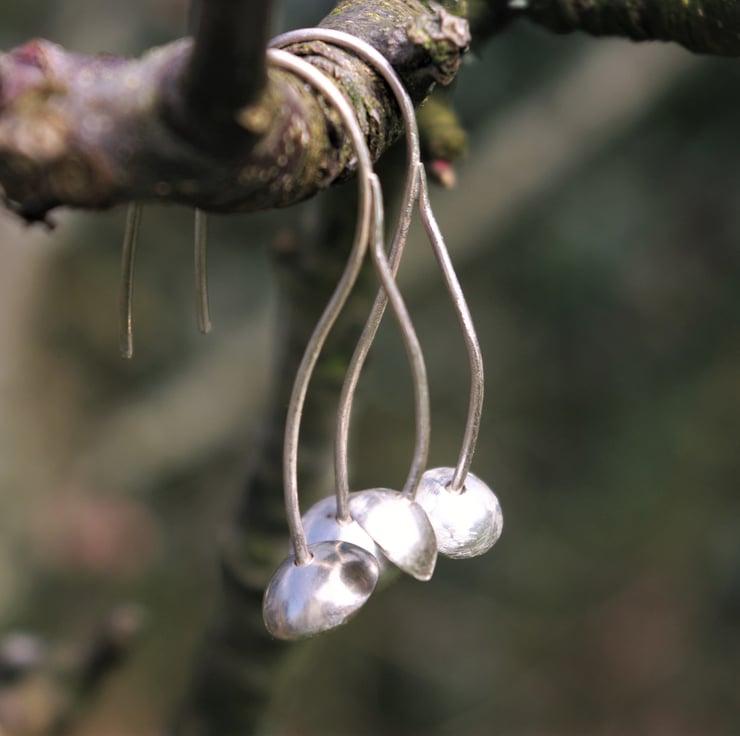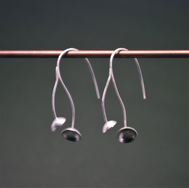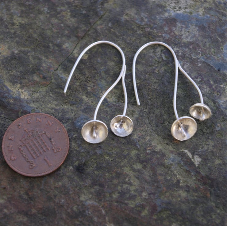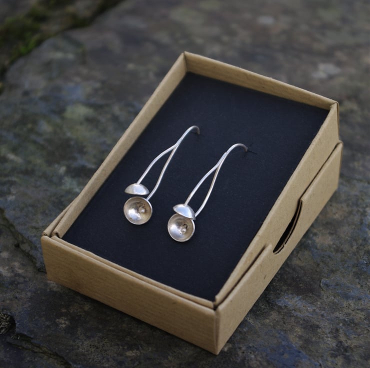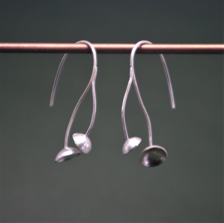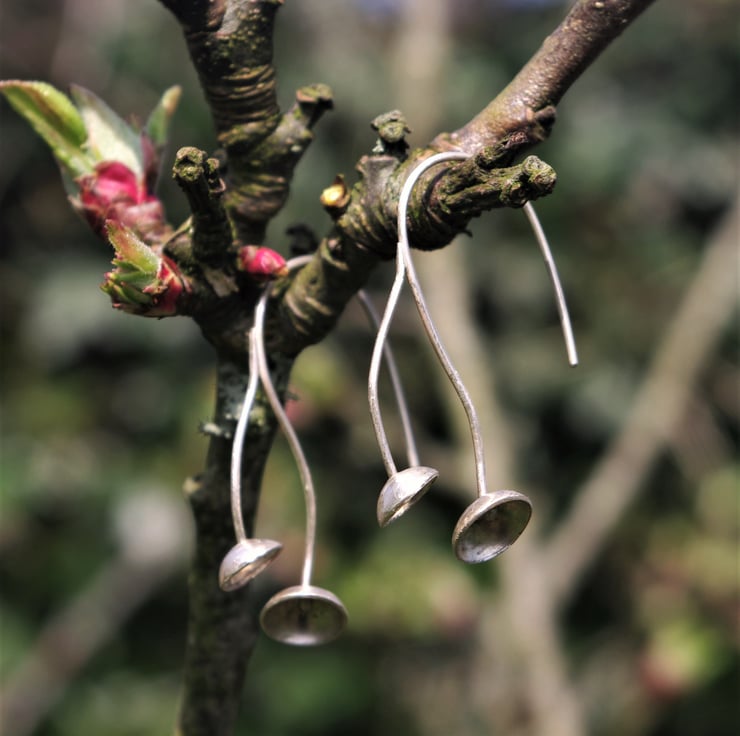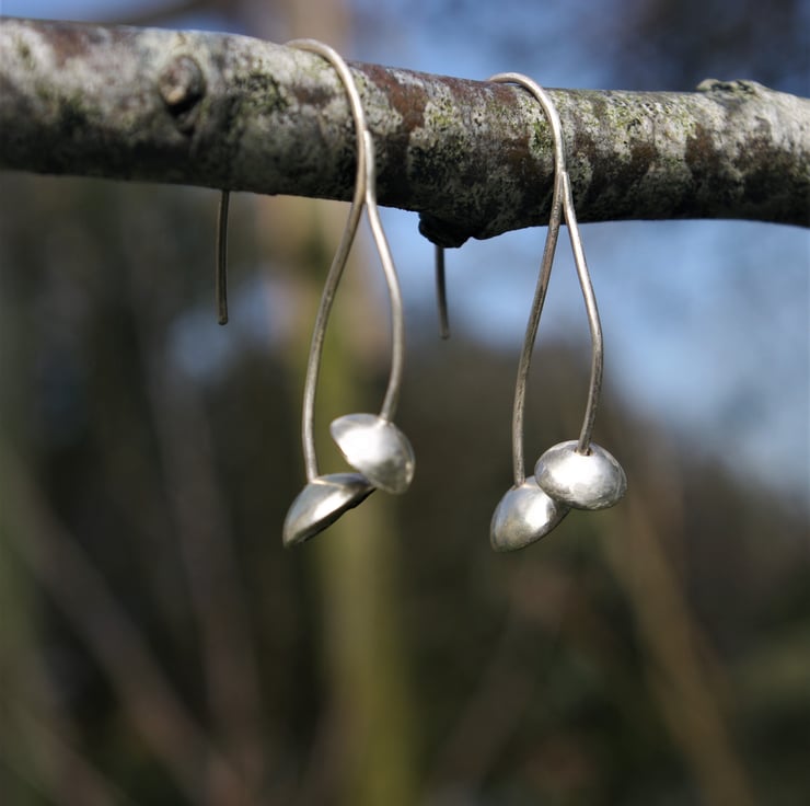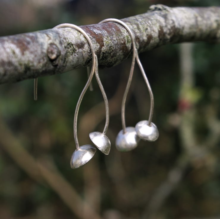Delicate organic silver bells dangle from sterling silver ear hooks. The cup shapes move freely about and are held in place by a blob of silver at the ends of the wire. The silver is from a UK supplier that uses recycled silver.