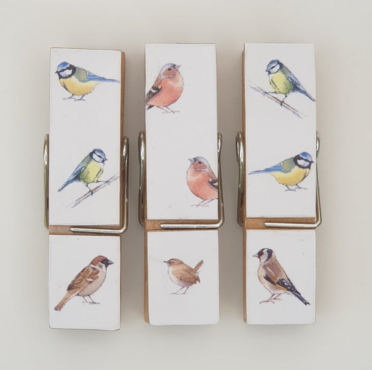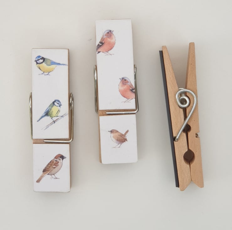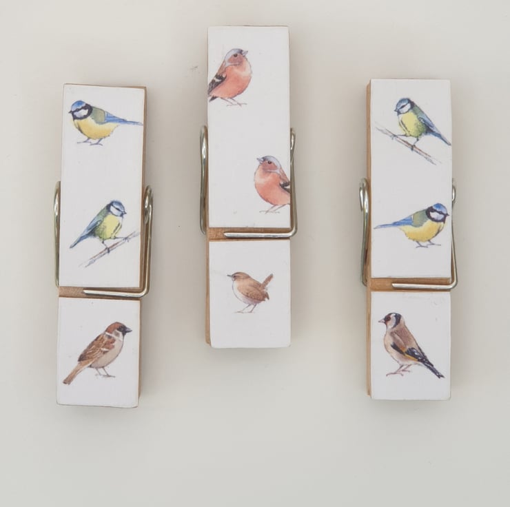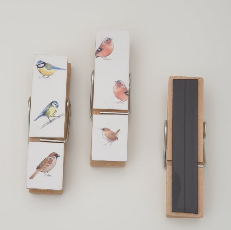 Lovely set of 3 peg fridge magnets featuring garden birds. They have been decoupaged and then several layers of sealer applied. A magnetic strip has been added to the length of each.