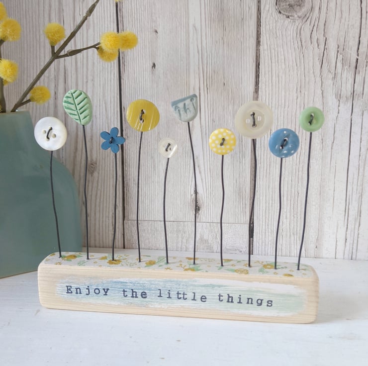 Button flowers grow in a row in this little garden with a clay leaf and clay flower. They stand on their wire stalks in a wooden block with a decoupaged floral top.
