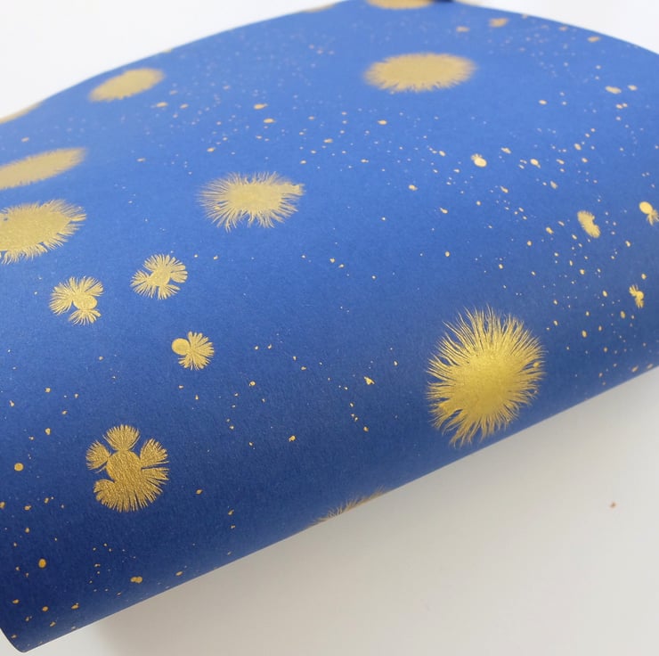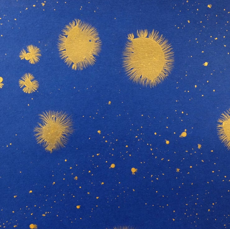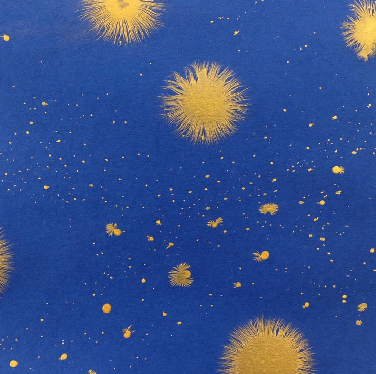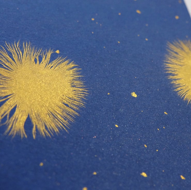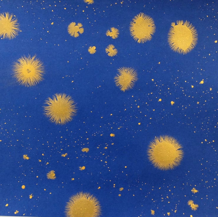 Another version of my new unique 'star burst' pattern, this time with feathery golden stars (or suns!) on a lovely blue background with lots of tiny gold dots and mini feathery shapes between the larger ones.