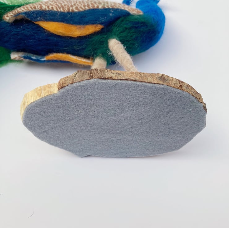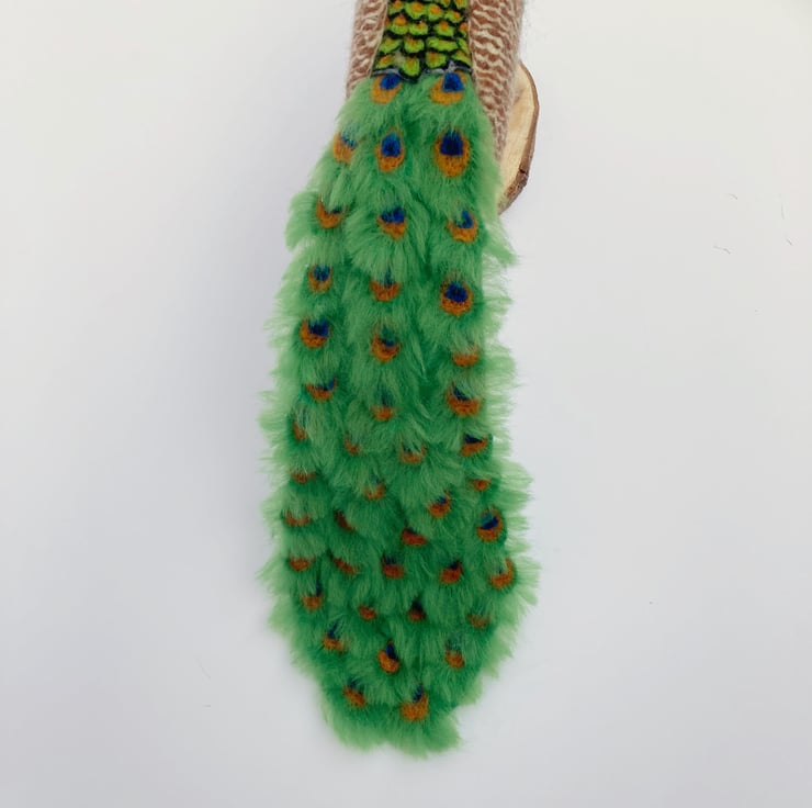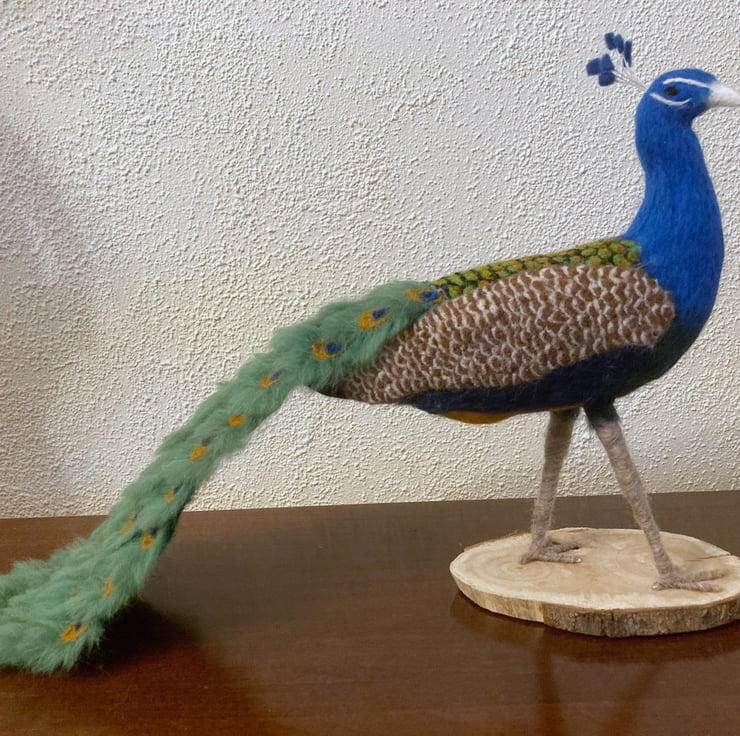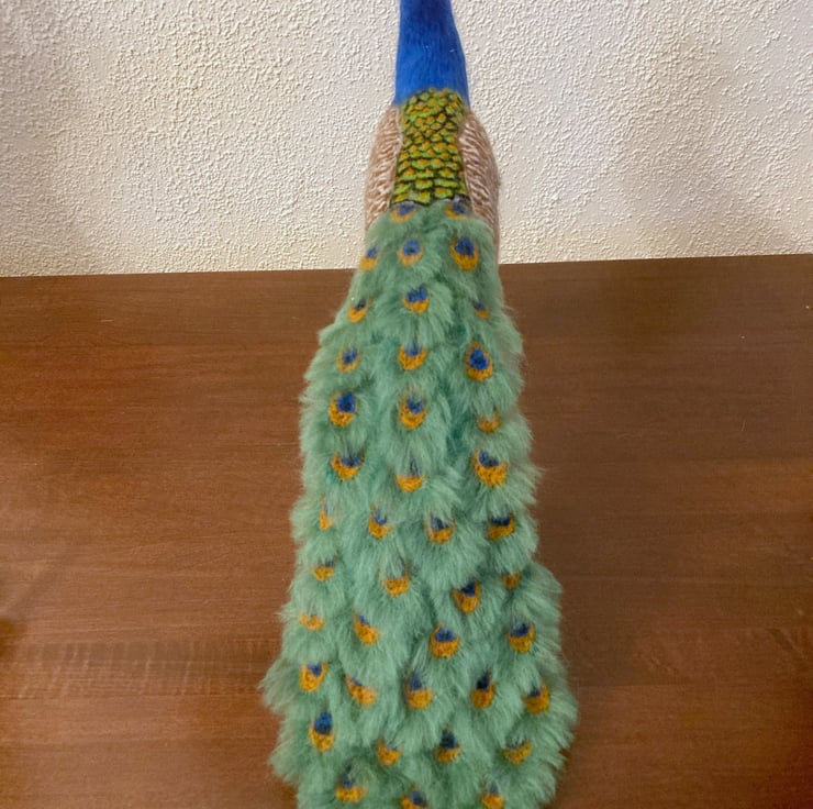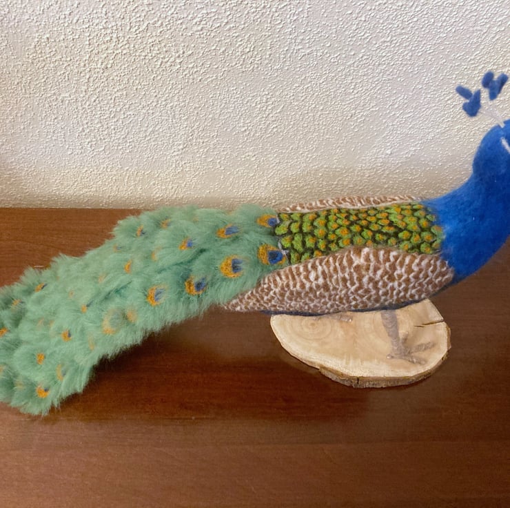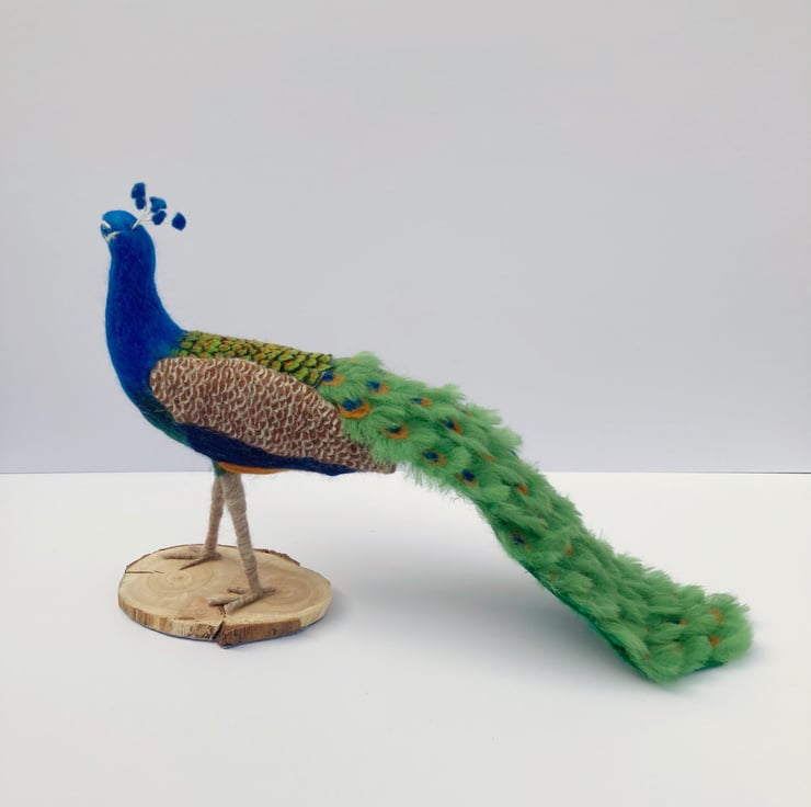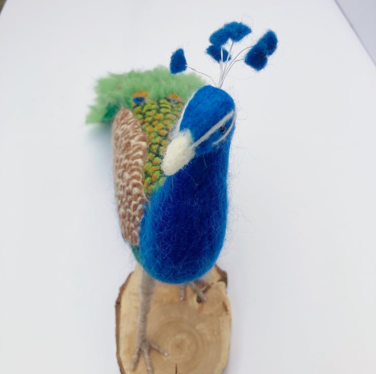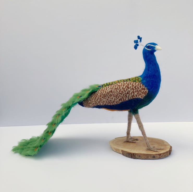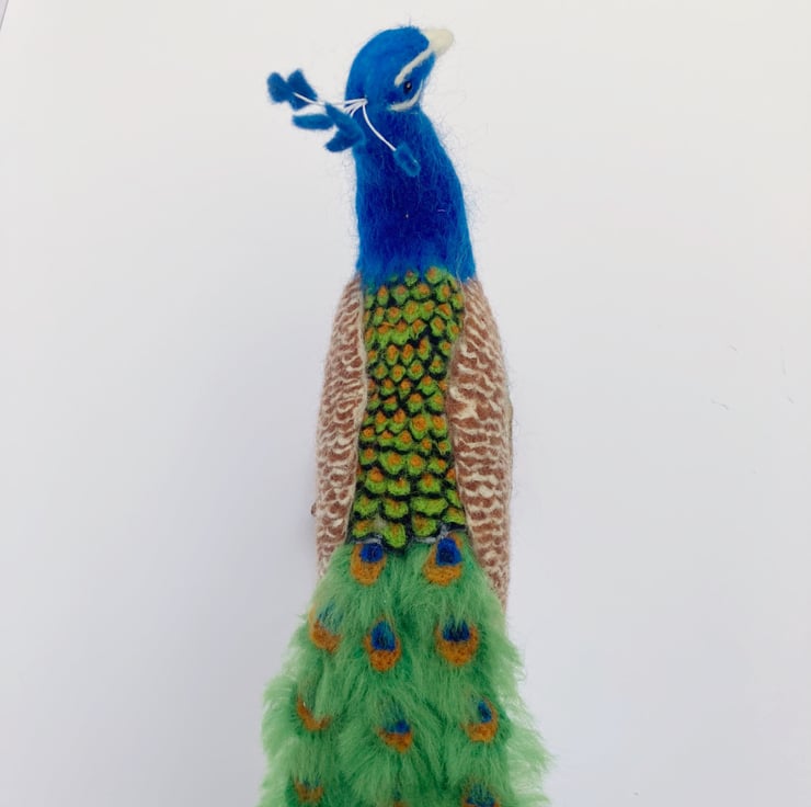 This bright and colourful peacock has been sculpted using a needle felting technique. A core of woollen fibres have been sculpted into shape using a barbed felting needle and then covered with appropriately coloured merino wool fibres. The tail feathers have been made individually and mounted on a felt base. The feathers on the wings and back are all individually needle felted. His legs have been felted over a thick wire/wooden base to provide good stability and the peacock has been mounted on a wooden base which has felt on the underside to prevent scratching of furniture.