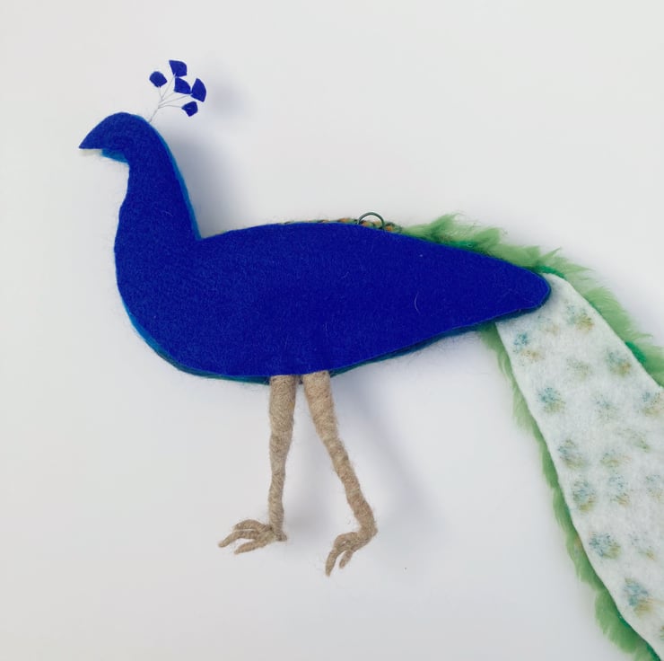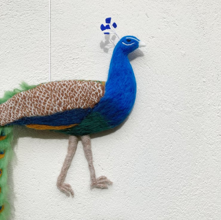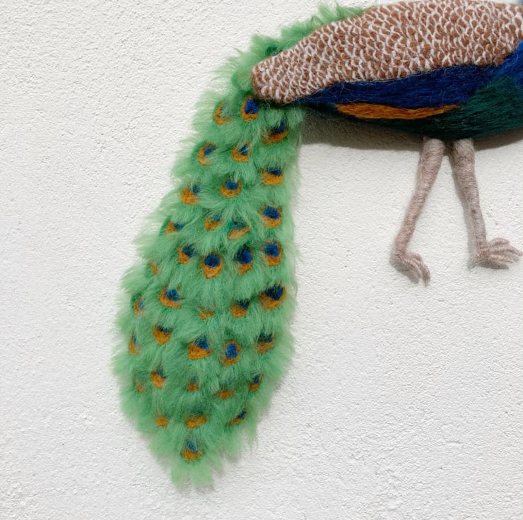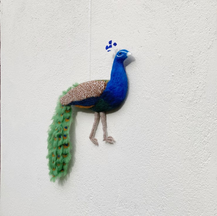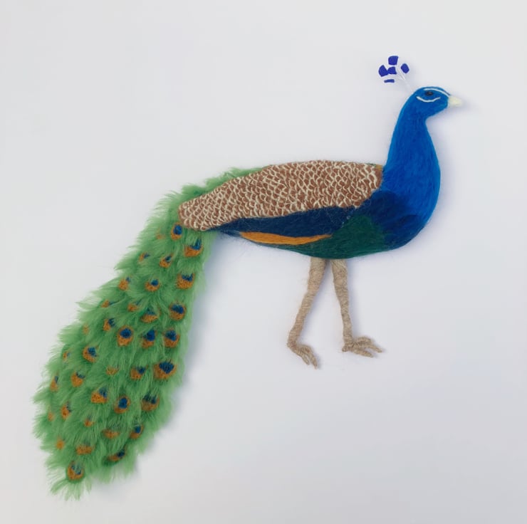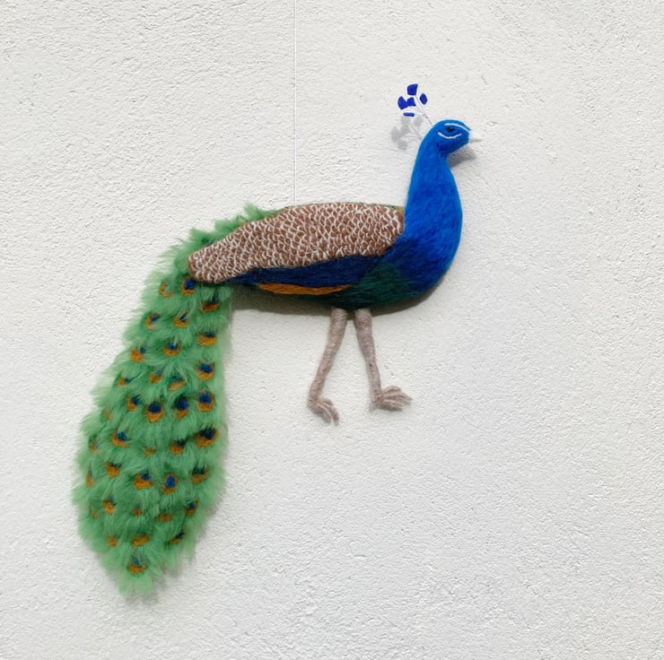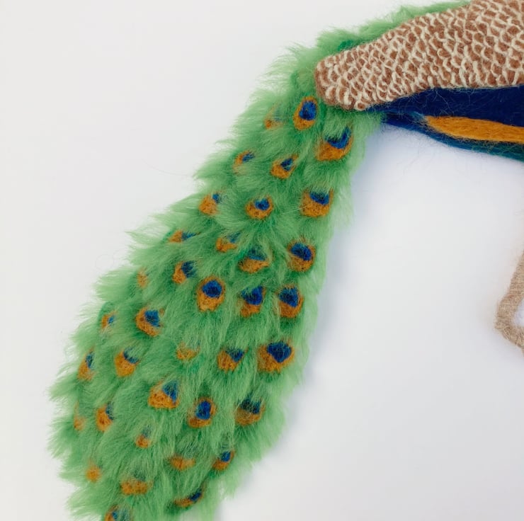 This wall hanging of a splendid peacock is a 3d needle felted sculpture which is flat on the reverse allowing it to hang naturally on the wall. The peacock has been sculpted into shape using woollen fibres and a barbed felting needle and covered in appropriately coloured merino wool fibres. The feathers on the back and wings have all been individually needle felted and each tail feather has been individually crafted, wired and mounted on a felt sheet. The wires allow the tail to be adjusted slightly. The flat, reverse side has been covered with a blue felt sheet and a small hanging hook added.