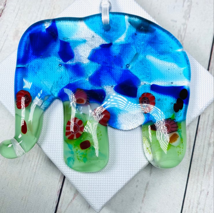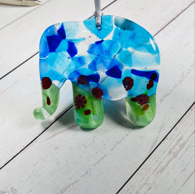 The elephant makes a truely unique and gorgeous glass hanging decoration or suncatcher . It is drilled and strung with white satin ribbon and presented in a white linin gift box .