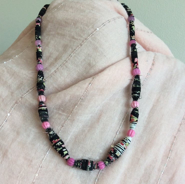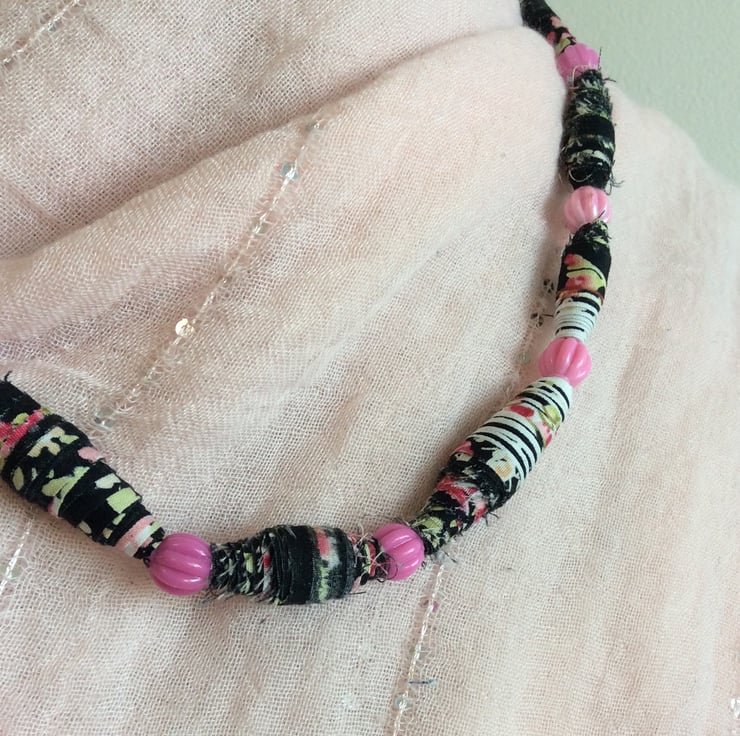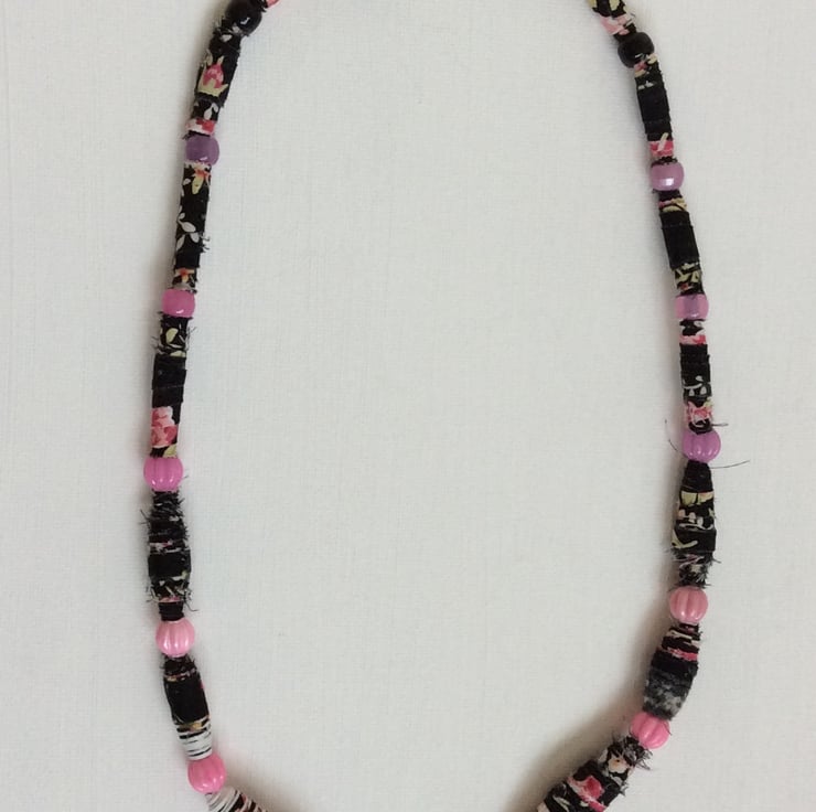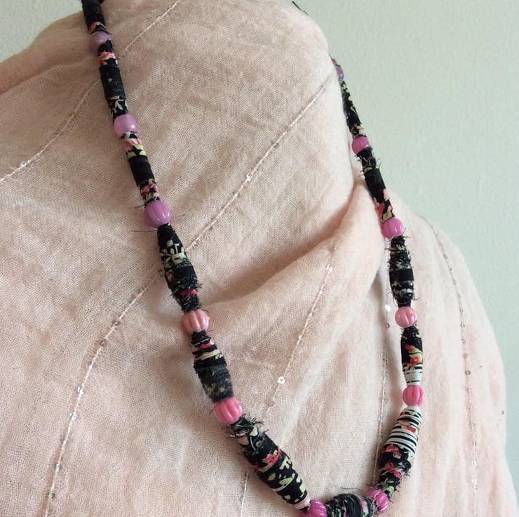 This statement necklace has 17 handmade rolled beads made from a black cotton, floral fabric . The beads are made from strips of the fabric with raw edges, so there will be some loose threads. In between the fabric beads are pink and black plastic beads. The beads are strung onto a length of recycled black cord. The beaded section measures approximately 63cm. The necklace slips over the head and is permanently fastened with a knot in the cord.