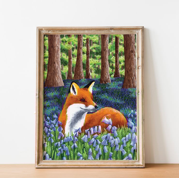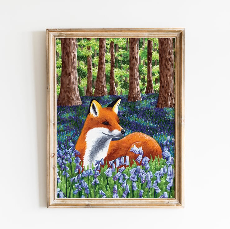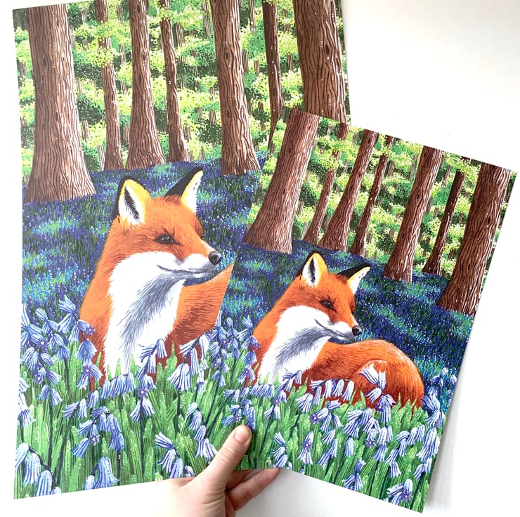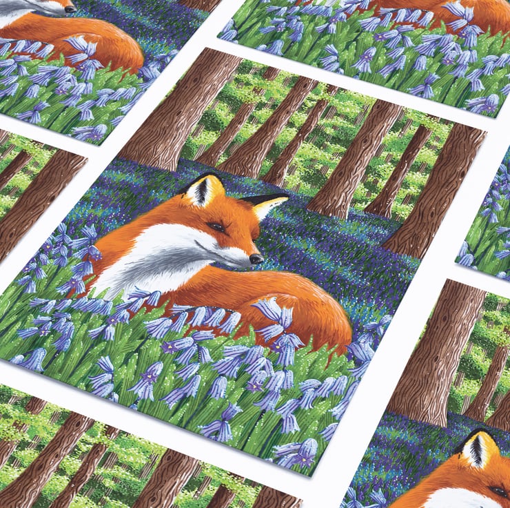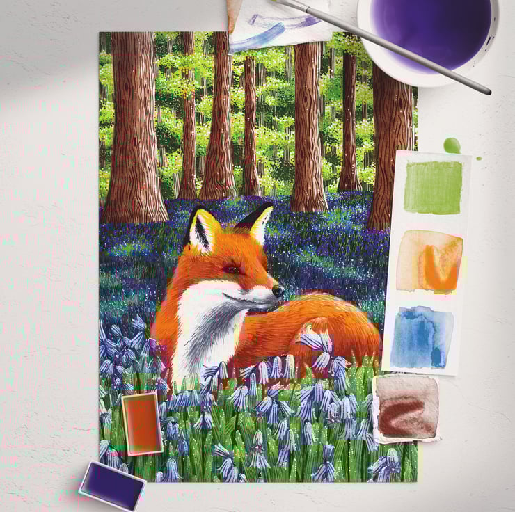 Inspiration for this print was how amazing hundreds of bluebells looked all together under the trees. I also wanted to add the fox as i think every loves seeing red fox out and about. Together this print is the finished artwork.