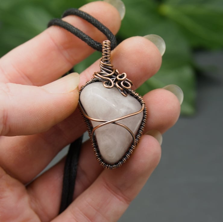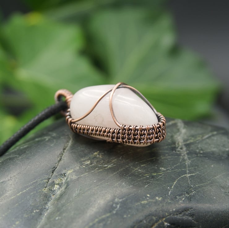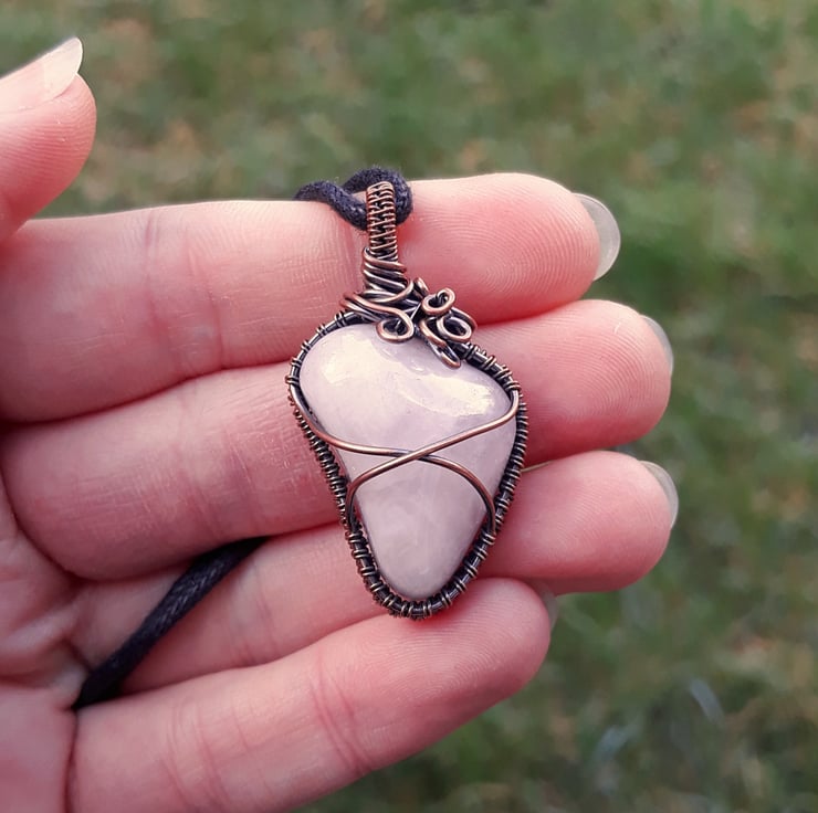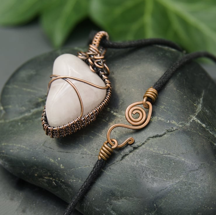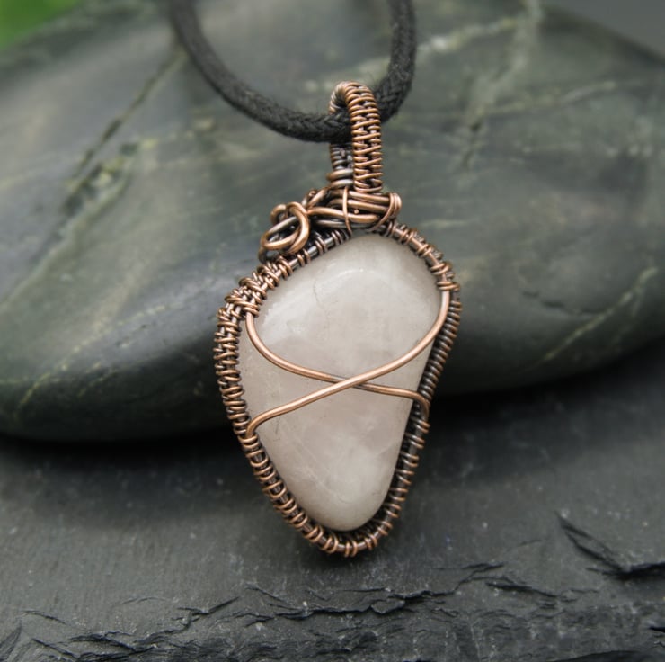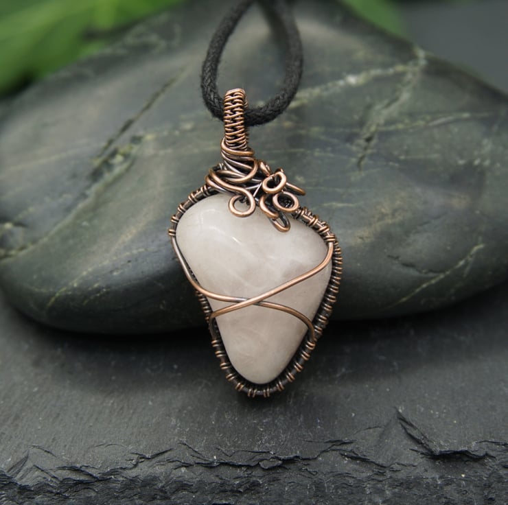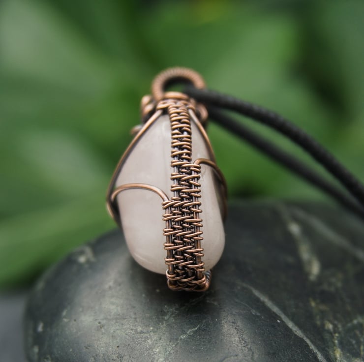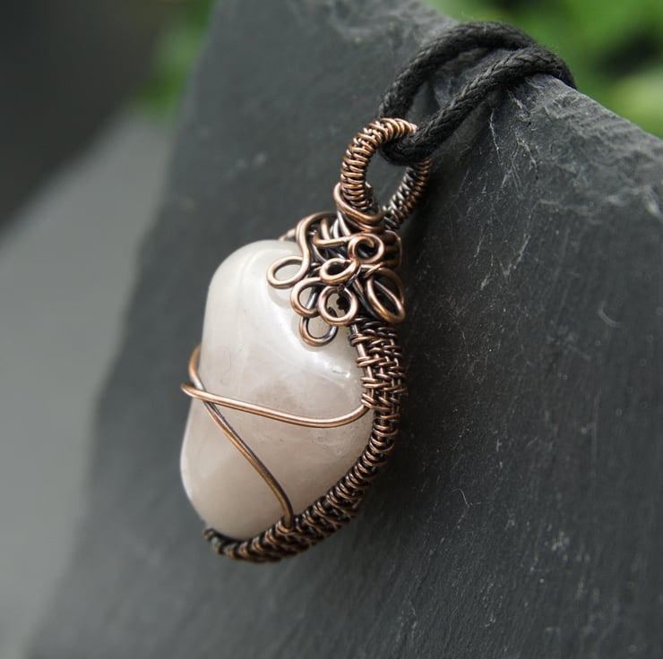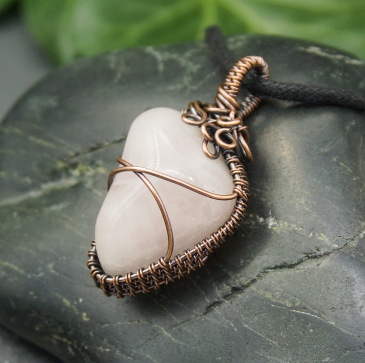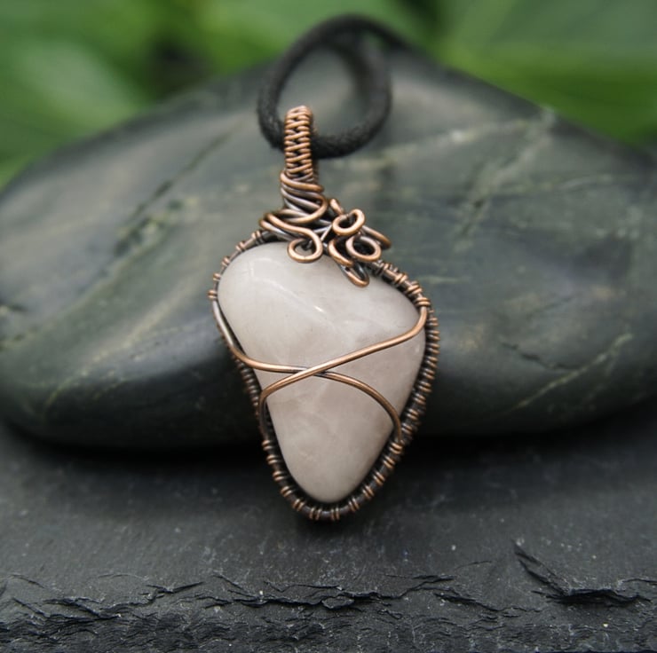 This gorgeous, one-of-a-kind pendant has been completely handmade from copper wire & features a lovely irregular shaped Rose Quartz tumble stone. The Quartz has been wrapped with a solid band of weaving around the sides, with two wires crossing the front & back to secure the stone. I've finished it off with a simple straight bail, & then a little collection of loops & spirals to one side, to balance the Quartz's unusual shape.