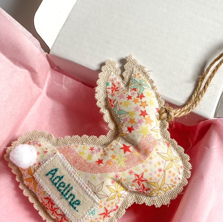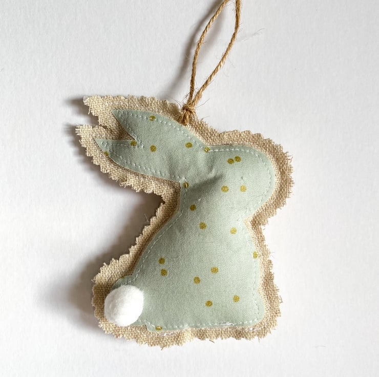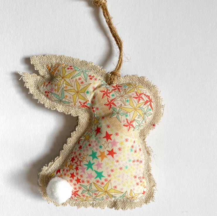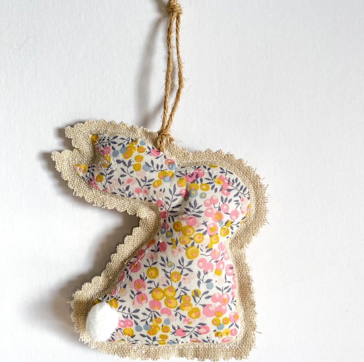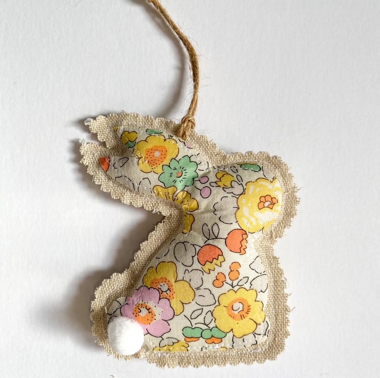 Bunnies are made from linen and Liberty tana lawn cotton, they are filled with hollow fibre fill and finished with twine for hanging.