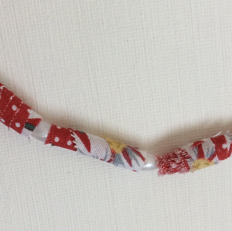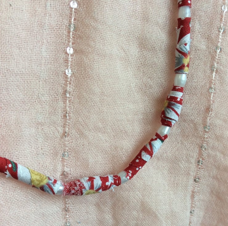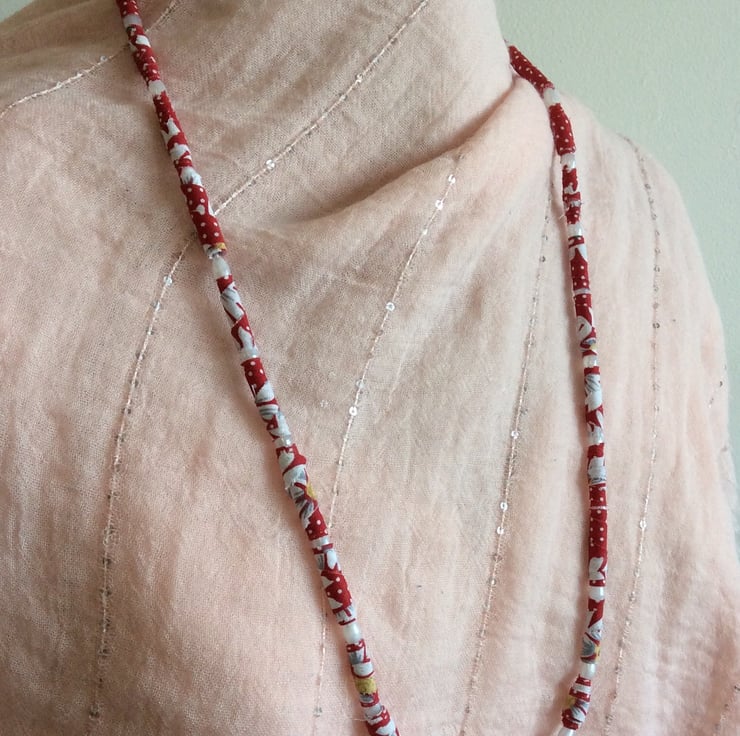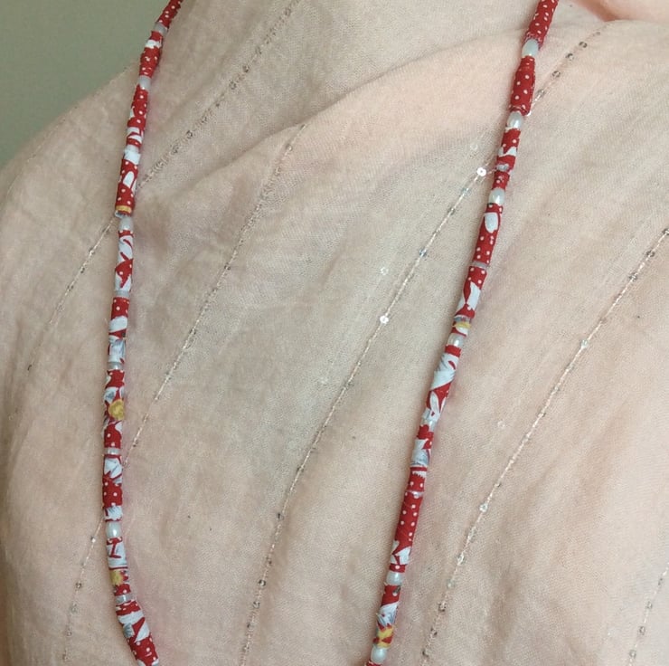 This statement necklace has 29 handmade rolled beads made from a red, white floral cotton fabric with splashes of yellow . The beads are made from strips of the fabric with raw edges, so there will be some loose threads. In between the fabric beads are white plastic beads. The beads are strung onto a length of braided polyester (Dacron). The beaded section measures approximately 86cm. The necklace slips over the head and is permanently fastened with a knot in the cord.