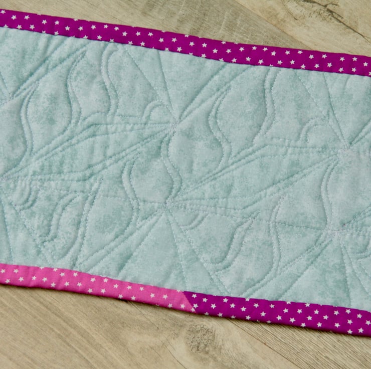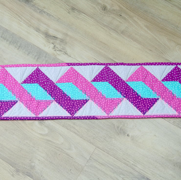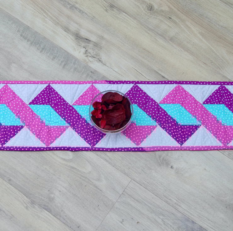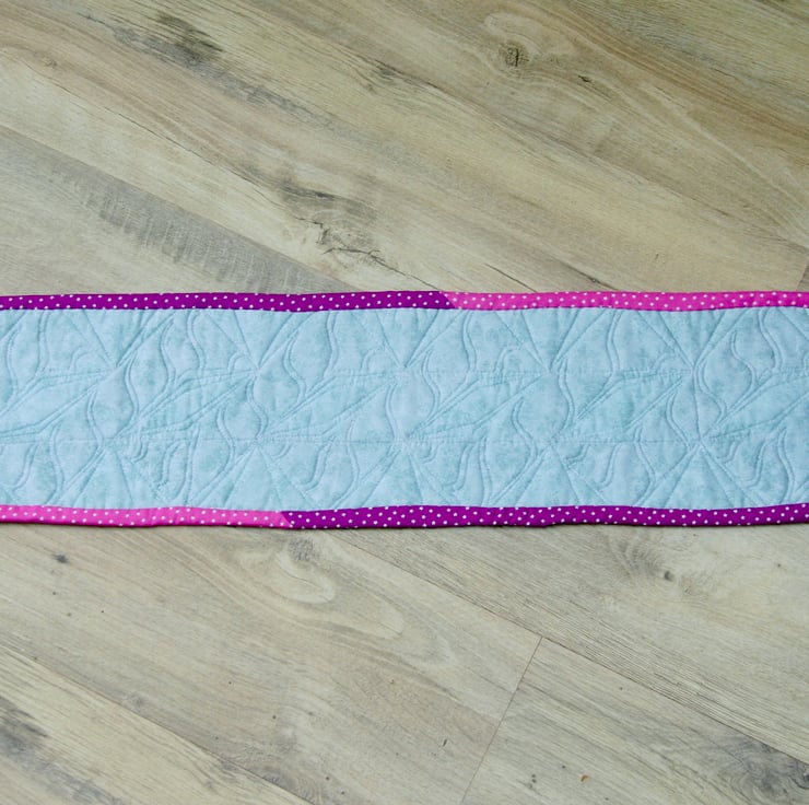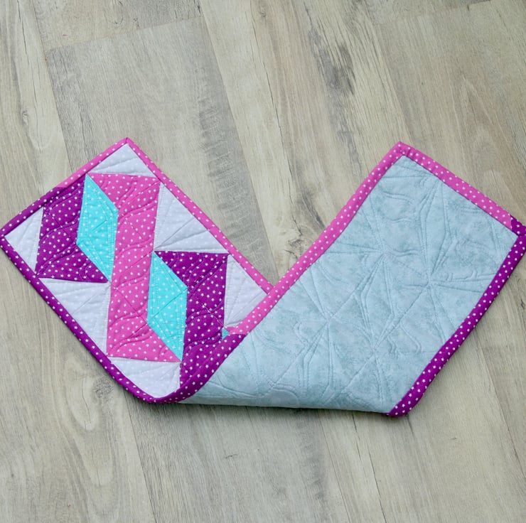 The patchwork design has been pieced together using light grey, green, pink and purple fabrics with tiny stars scattered on each colour. The table runner is backed with a very light smoky grey fabric and bound with the pink and purple fabric to match those twisted around the central grey pole.