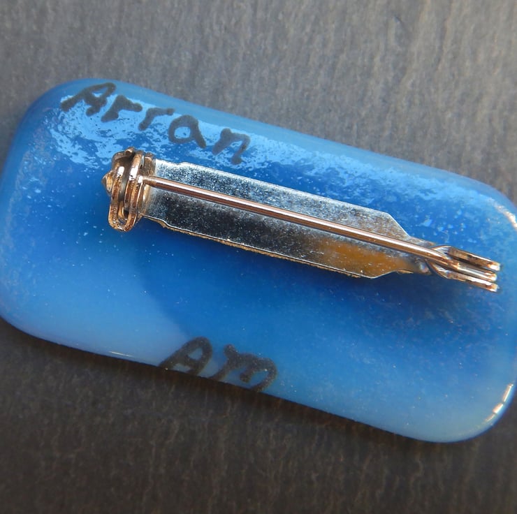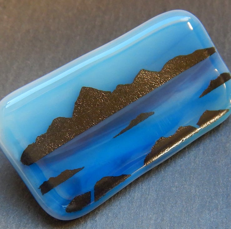 UNIQUE: Handmade Fused Glass 'ISLE OF ARRAN' Brooch. This brooch has been very carefully hand painted onto the surface of the wispy blue glass backing. No paint has been used but instead it is very finely ground fusing glass mixed with water. At this stage the blending of colours and adding of details was possible. The brooch was then fired in my kiln and the powdered glass and background fuse to become one piece.