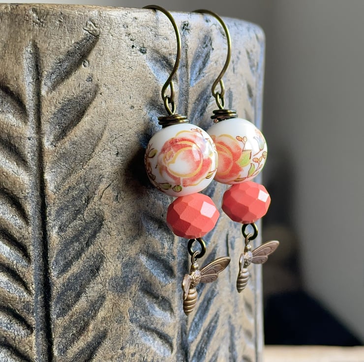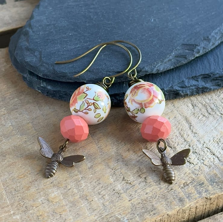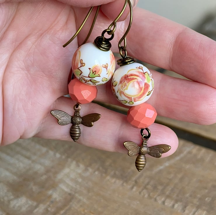 Below I have simply added matte coral peach coloured painted glass rondelles, along with beautifully detailed Vintaj brass bee charms.