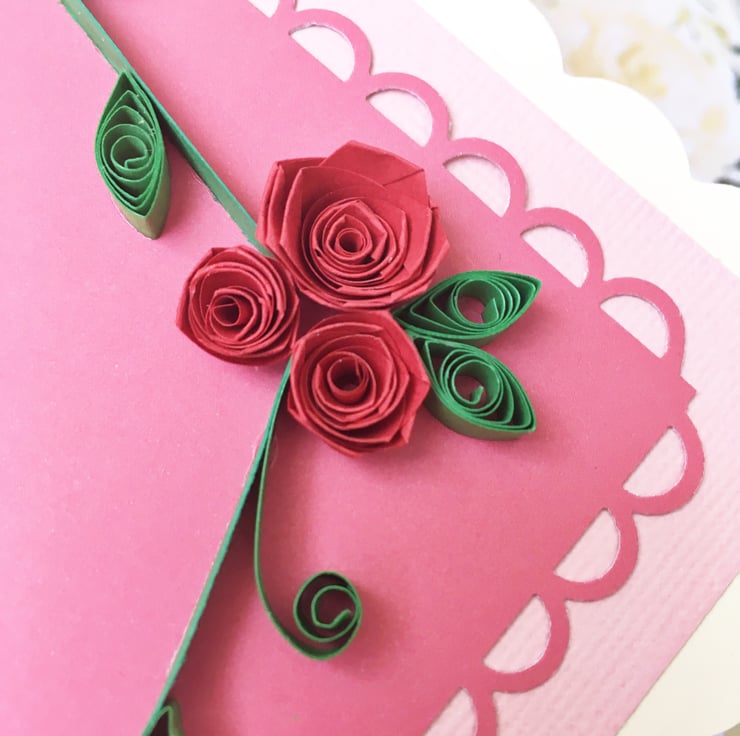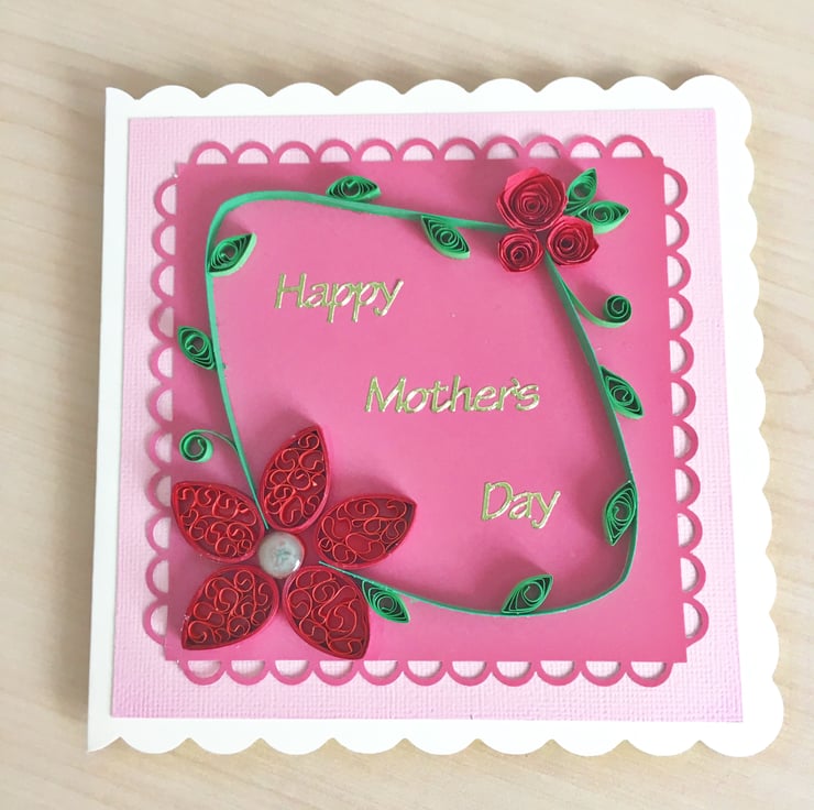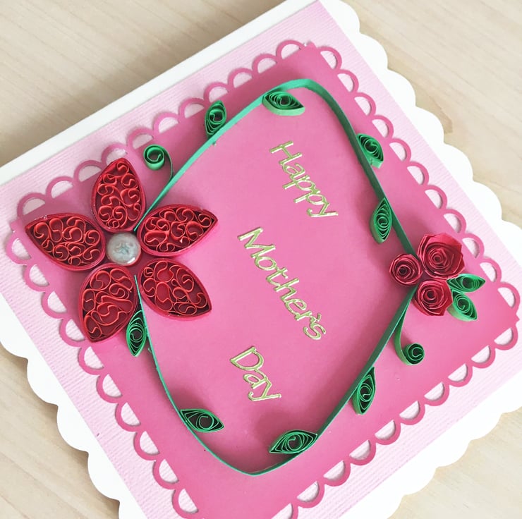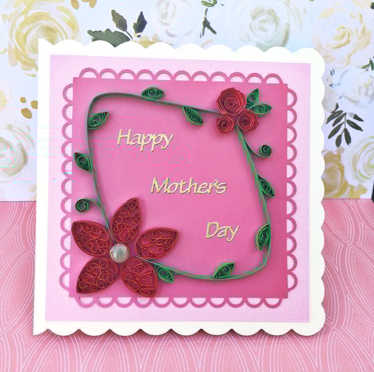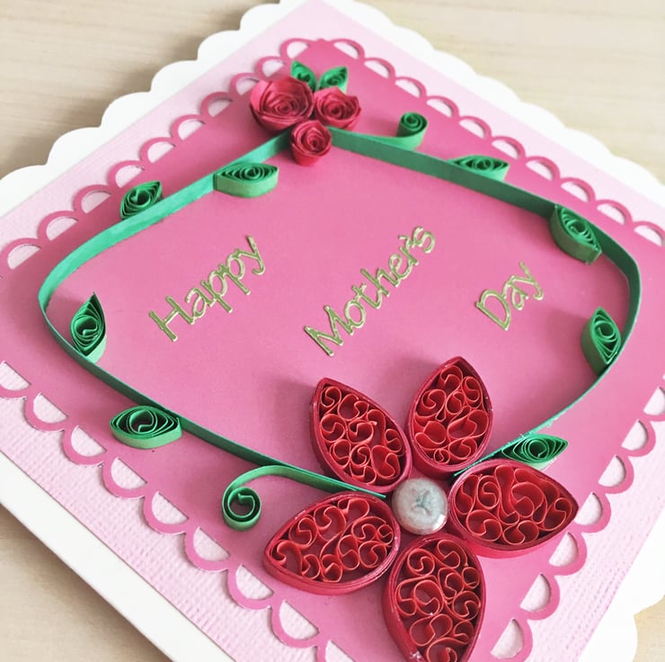 This card features a larger quilled red flower with an epoxy centre in one corner and a cluster of red roses in the other. The scalloped mat sits on a pink background and the card says Happy Mother’s Day in gold foil letters. Inside the card is blank for you to write your own greeting.