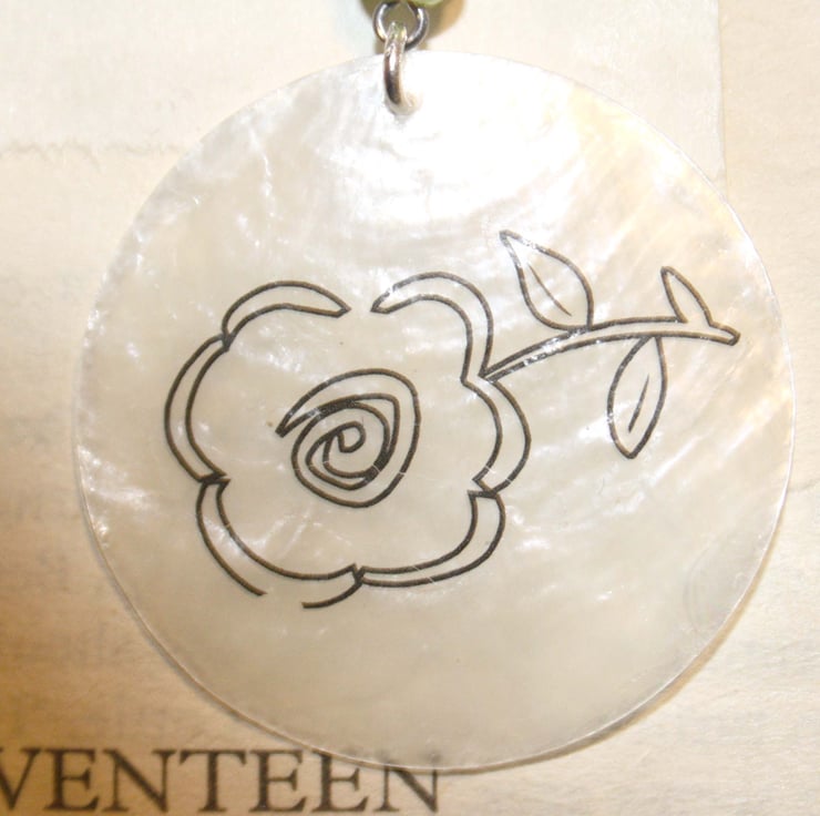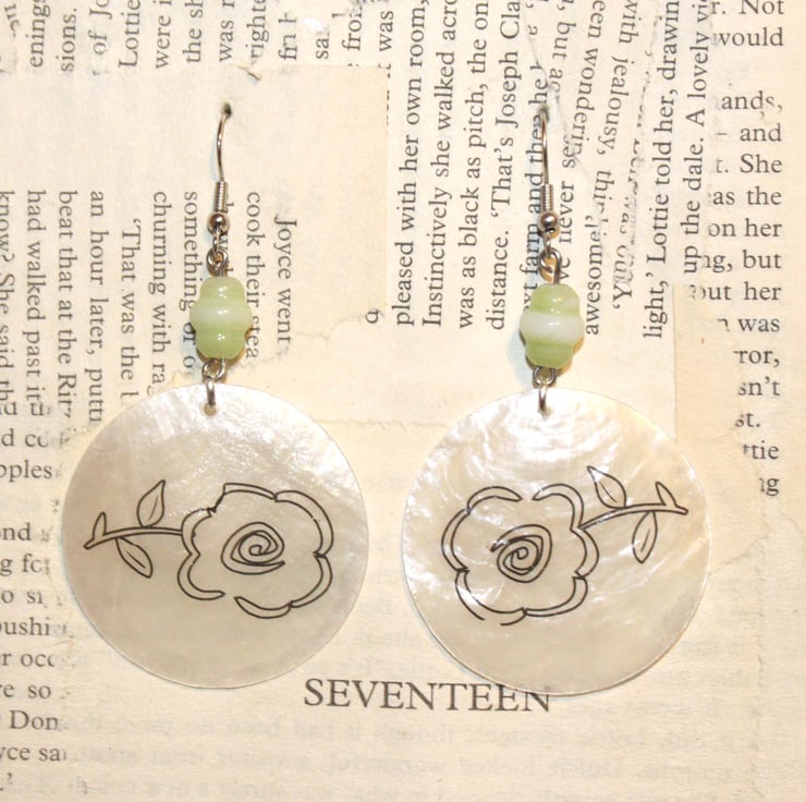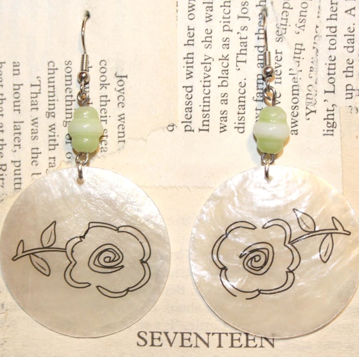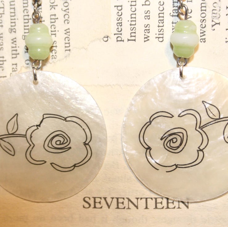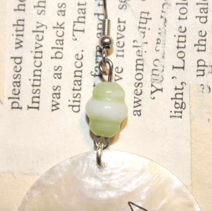 Water transfer decals of stylised flowers have been applied to circular shells. They hang from white and green glass beads, giving a perfect summer vibe.