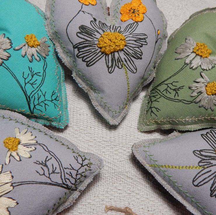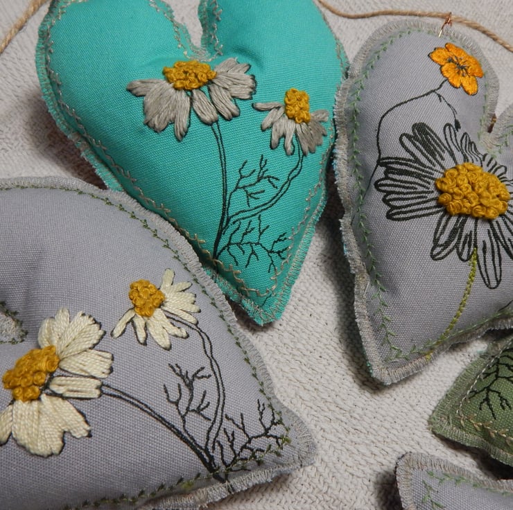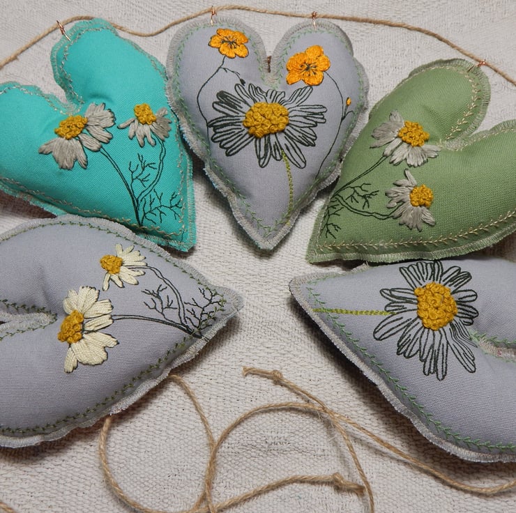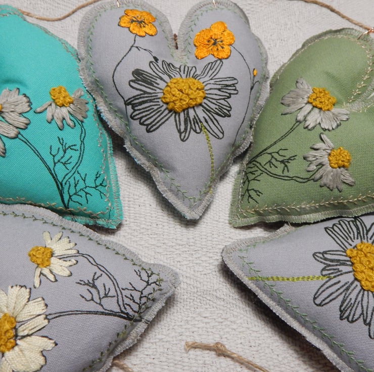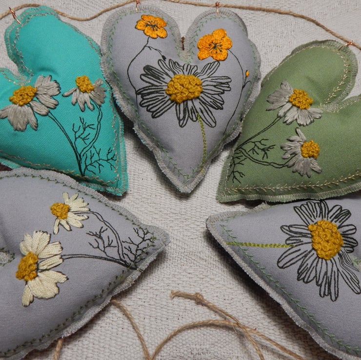 There are 5 hearts measuring approximately 14cm by 12cm. There is a mix of wild ox eye and chamomile daisies and buttercups. The flowers are screen printed and then hand embroidered just to make them pop a little. The hearts have a decorative stitch to the edge and are patchwork to the reverse.