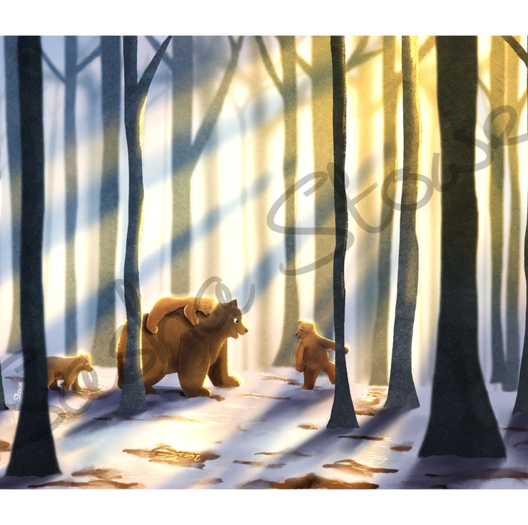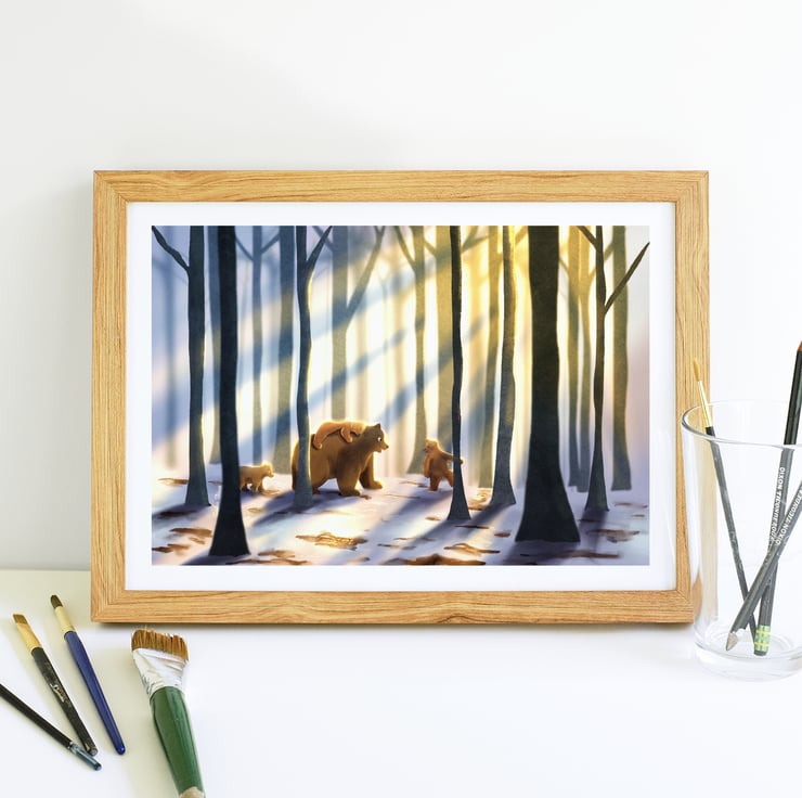 An adorable print of a family of bears taking a stroll in the forest. This illustration was done digitally by myself and would be perfect to decoration a child's bedroom with.