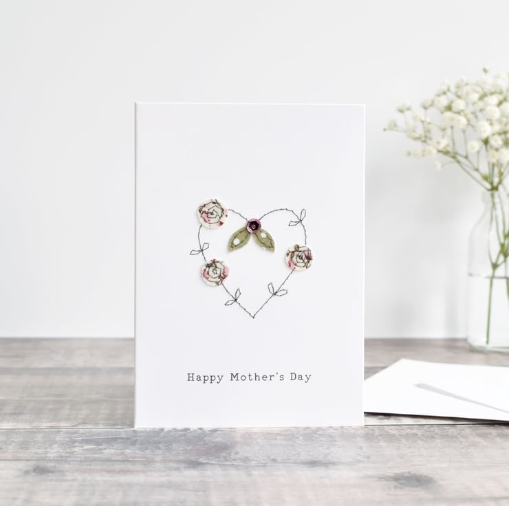 A lovely handmade Mother's day card with an embroidered heart.
