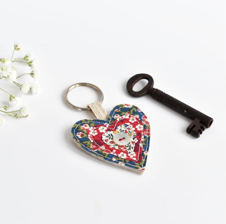 This simple but elegant heart key ring is made from pretty floral fabrics and is backed with wool felt. In the middle of the heart is a hand sewn small pearlescent button.