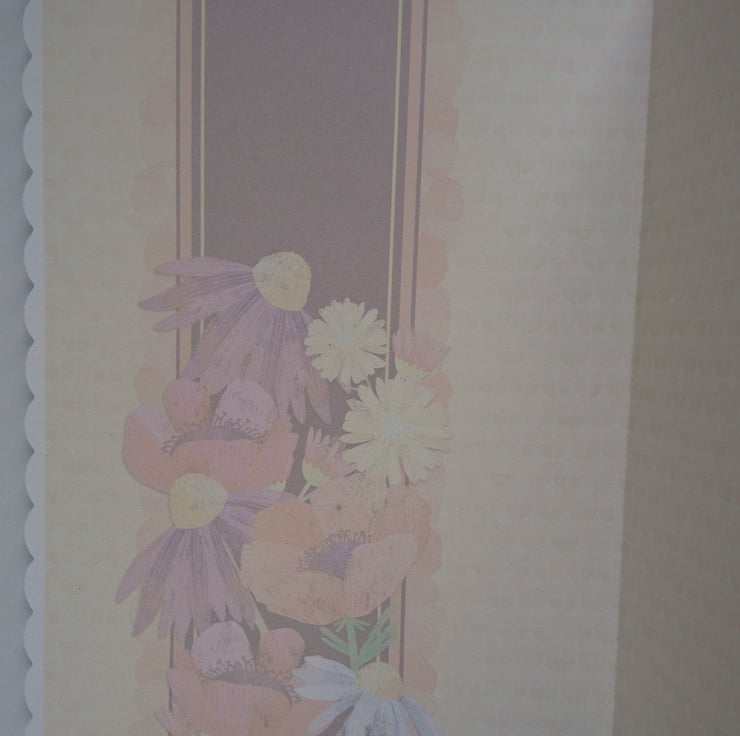 The design is a big splash of brightly coloured modern art style flowers including daisies and poppies.
