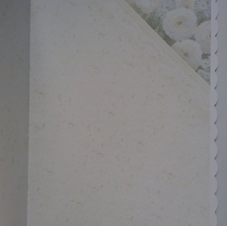 The design is a vintage bush of white roses. Can you smell their beautiful aroma?