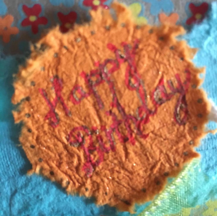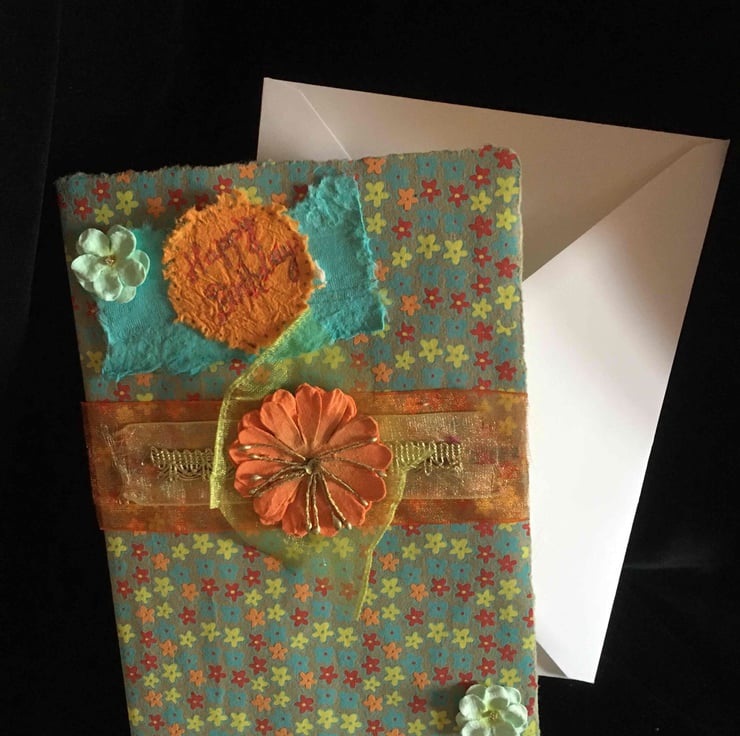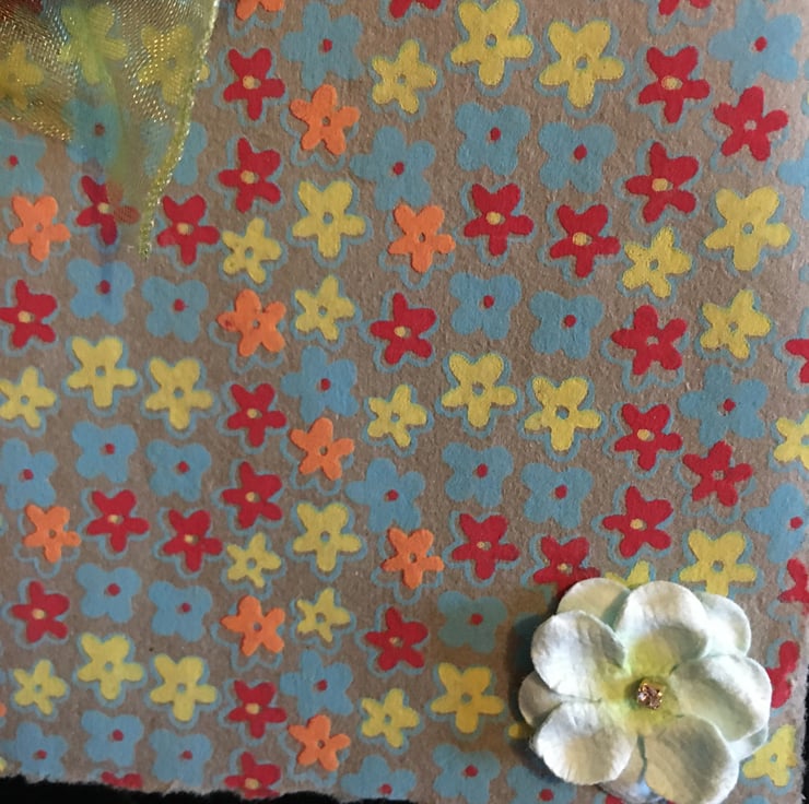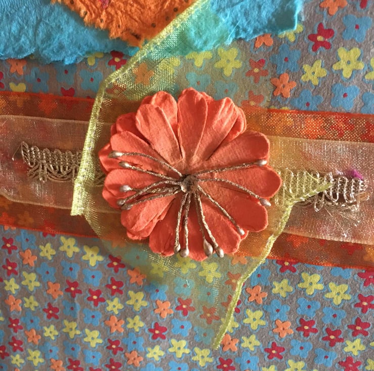 The orange and gold flower sits on a lime green ribbon piece in the centre