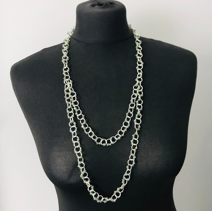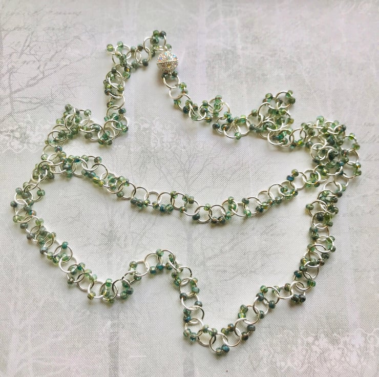 Double chain beaded link necklace. Handmade chain with green Picasso seed beads. Bead have really beautiful markings, see close up photo. Longest chain measures approx 67.5cms. Fastens with a rhinestone encrusted, magnetic ball clasp.