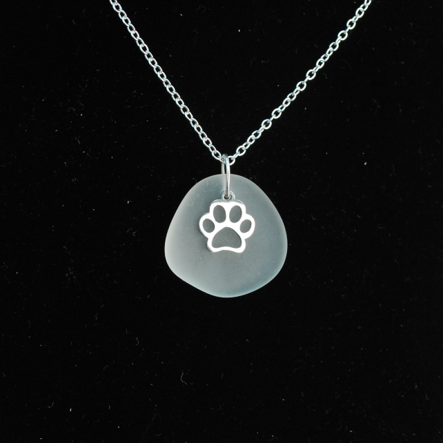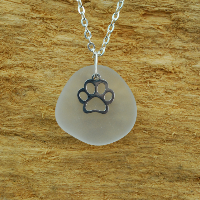 This pendant celebrates our love for animals with paws. A beautifully shaped piece of frosty white beach glass provides the background for a stainless steel paw print charm. We have tumbled the beach glass until it is smooth and picks up the light. The glass has come from an old bottle and is curved so it cradles the charm.