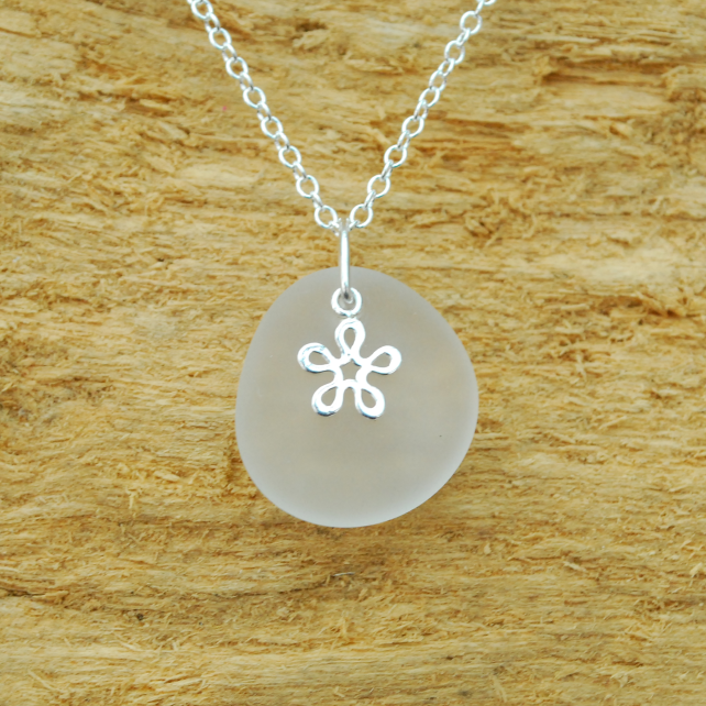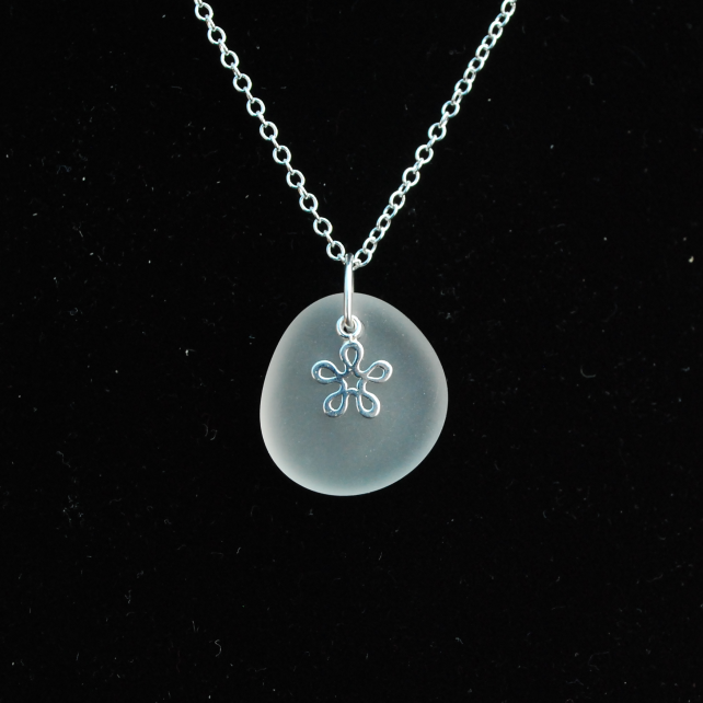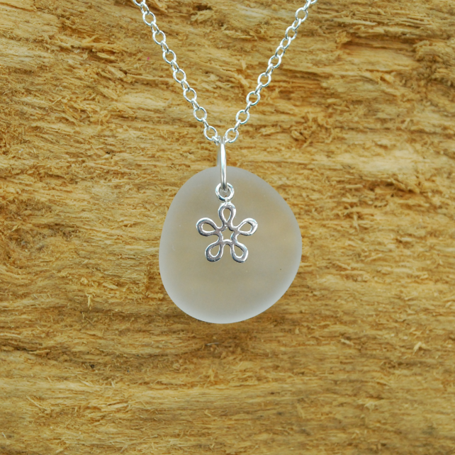 Beach glass is rarely as round as this piece. Glass tends to break in straight lines, but old bottles can break in curves because of their shape. The bottom of the bottle can produce a circular piece of beach glass after being in the sea for a long time. This lovely little piece of tumbled beach glass looks wonderful behind a tiny sterling silver flower charm. Pendants of this colour look great against all colours of background. All the metal in this pendant is sterling silver.