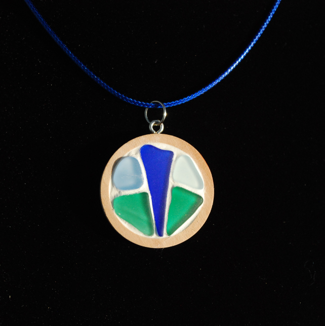 We save special small pieces of beach glass for our mosaic pendants so they will get noticed. The centre piece of this interesting pendant is a beautiful blue shard, which has come from a poison or medicine bottle. Around the shard are pieced of pale blue and aquamarine beach glass. We have tumbled the glass so it is rounded and smooth. The back of the pendant is natural wood.