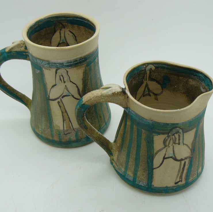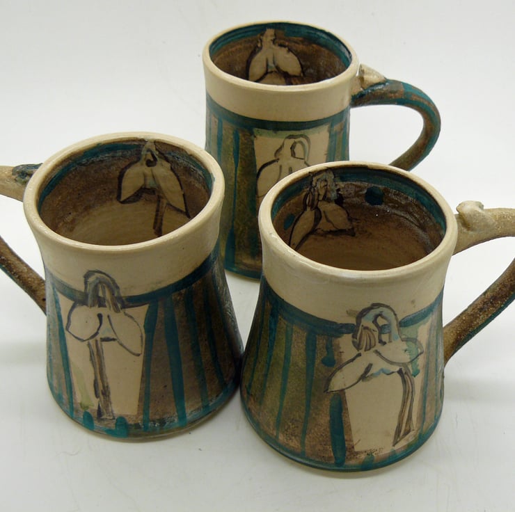 Thrown on the wheel & later hand decorated with snowdrops. I draw onto newspaper, then paint this with coloured slip & apply to the damp mug. I then sponge over greeny brown slip & peel off the newspaper & touch up each drawing. Approx 12 x 10cms. Little snowdrops are on top of handle. Fine for dishwasher as high fired to stoneware. All slightly different as made in seperate batches.