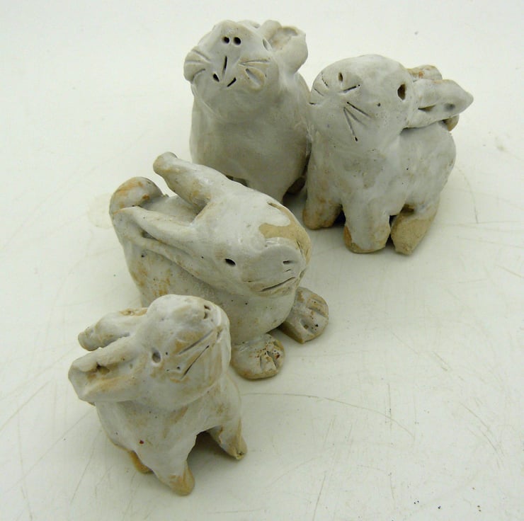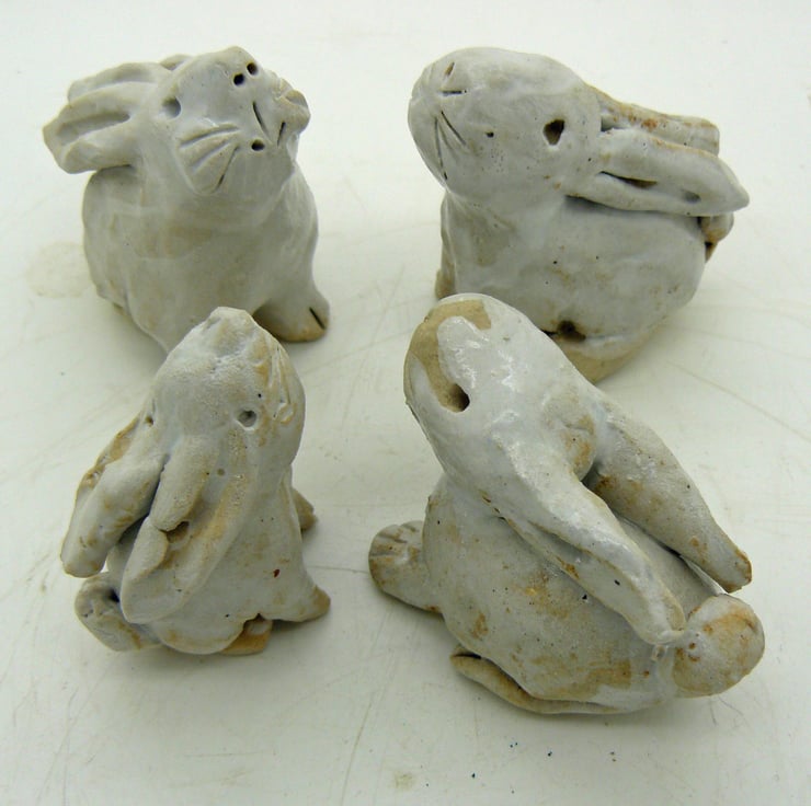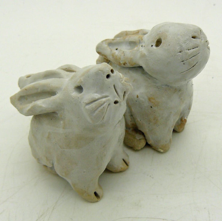 Clay small Rabbits approx 3 x 4 cms. Made by the modelling method. Glazed with a white stoneware glaze. £10 each or 2 for £17. Just the 2 rabbits on right, on the 3rd picture are left now.