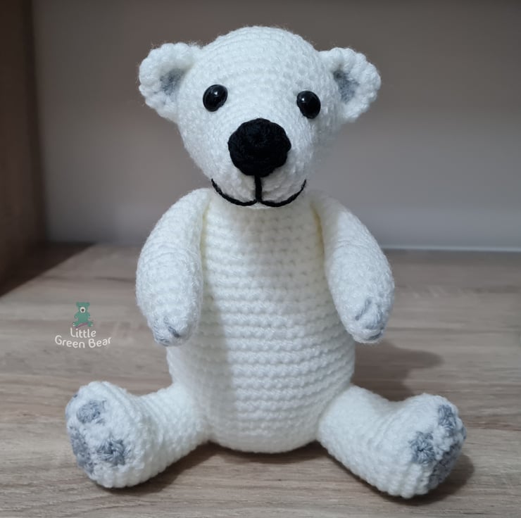 Preston the polar bear loves swimming and spends hours every day in the water. He also enjoys sticking his head down holes in the snow, looking for seals… At the end of the day, he’ll head home for playtime and snuggling with his family. He sits just over 8 inches tall (when made with the recommended materials).