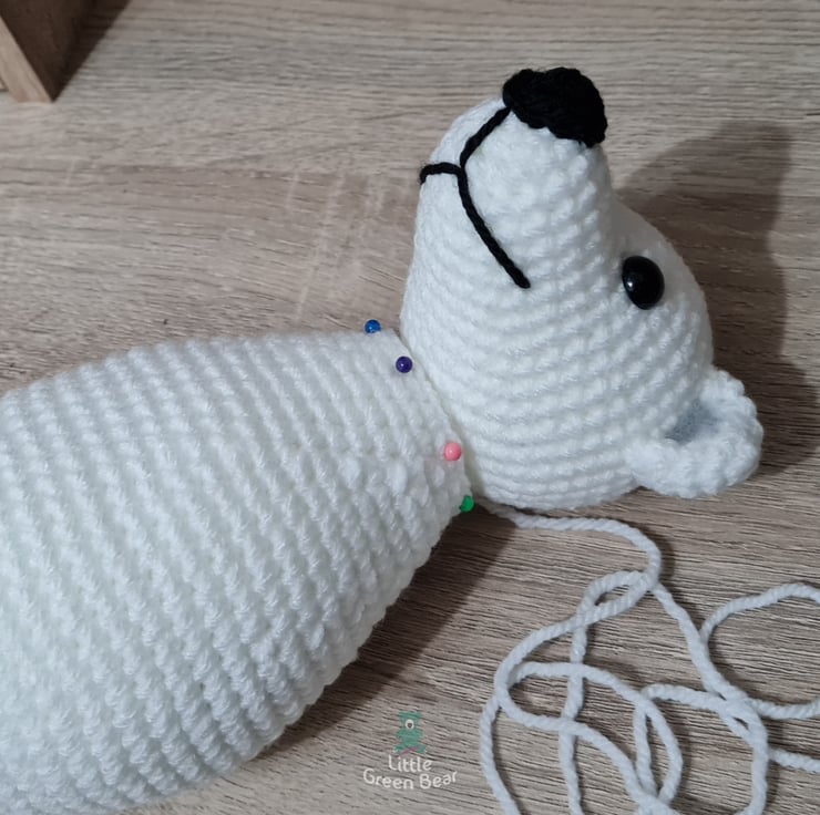 The 11 page pattern is intermediate skill level and uses UK terminology – if you would prefer US terminology, please message me. It is clear to follow with detailed instructions and lots of pictures for step by step making and assembly. There are also picture instructions for colour change, back loop only, invisible finish and the scarf.