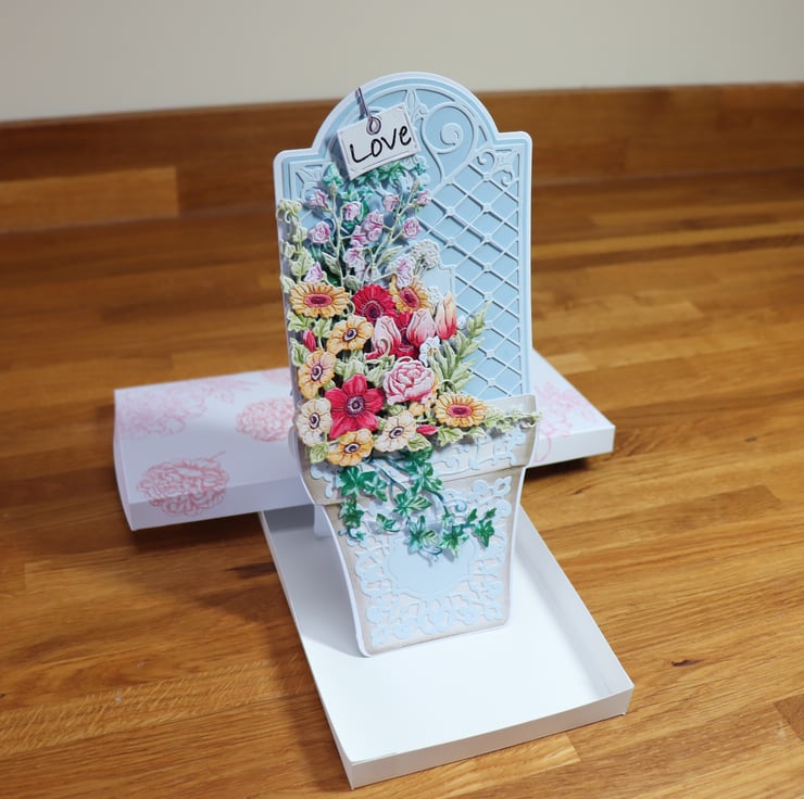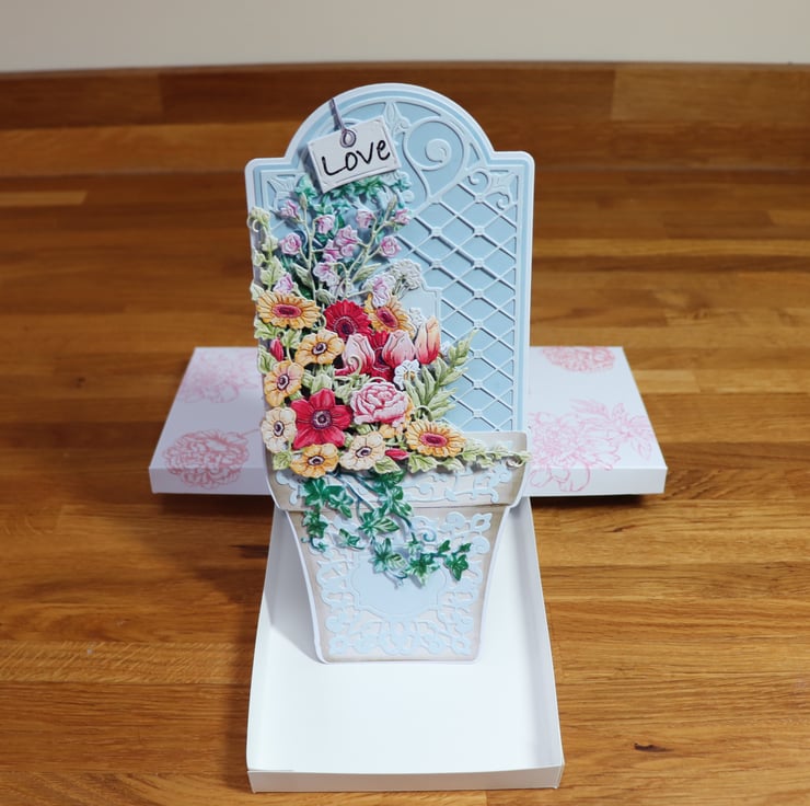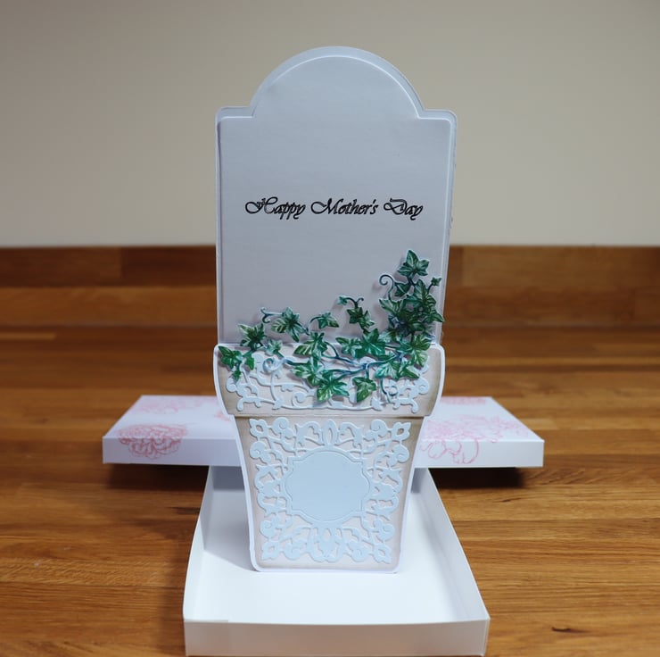 The card base is in the shape of a flower pot with a trellis of blooms and Ivy, the sentiment on the back of the card is, Happy Mother's day with Ivy under that.