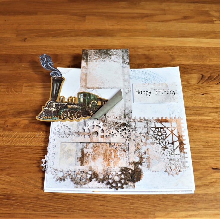 There are many layers to this card, I have also embossed the card and papers with a steel effect, there are cog wheels vintage train and a steam engine, the back of the card is where you write your message.