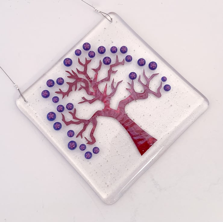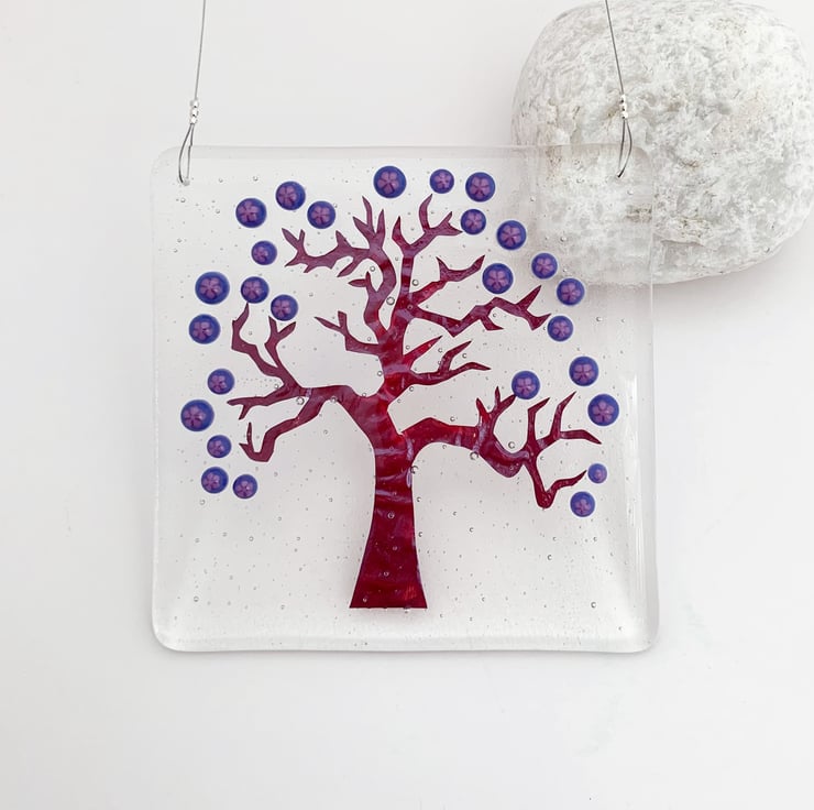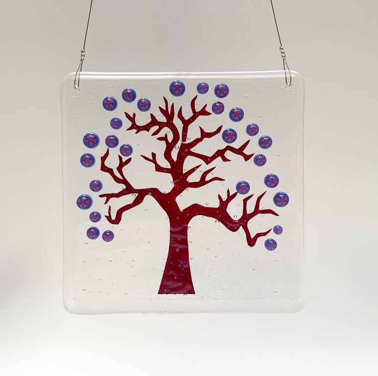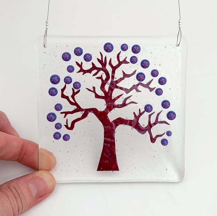 Fused glass hanging tree suncatcher, inspired by delicate Japanese Spring blossom. A beautiful gift, it looks lovely in a window, giving a splash of colour.