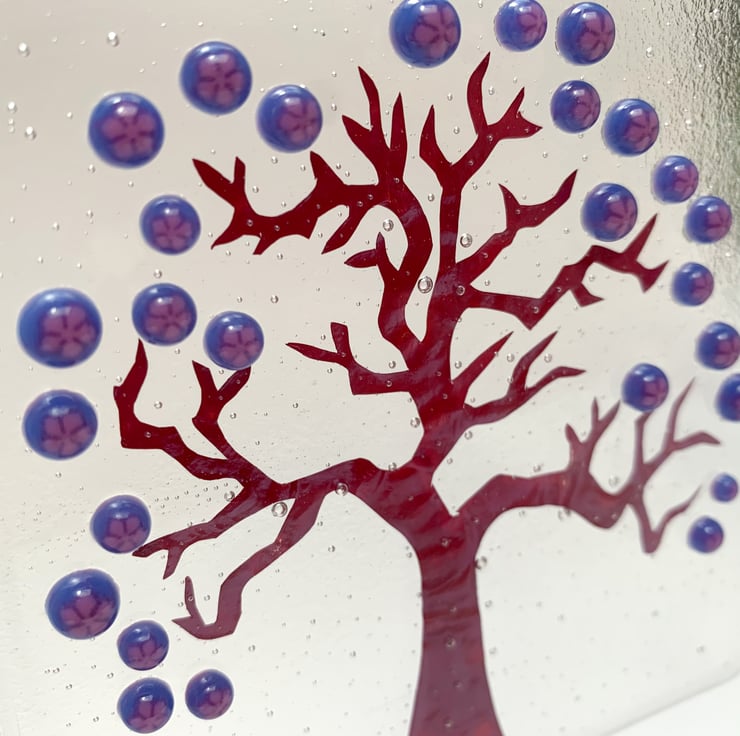 To make this hanging, I hand cut a tree shape from very thin copper foil with a scalpel. I then cut 2 squares of transparent art glass and sandwiched the tree between the layers. Next, I fused it overnight slowly in my kiln. The heat of the kiln turns the copper foil a lovely deep red colour. I then added blue and pink opaque flowery glass dots which I have made previously. A second firing is done overnight the next day to tack fuse the dots onto the design, so that they stand proud of the glass, giving it a 3D effect.