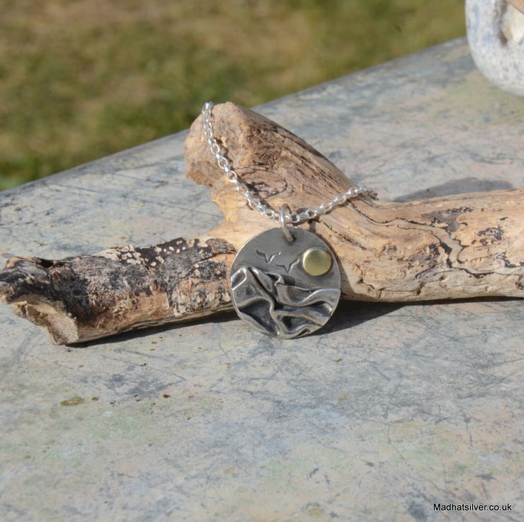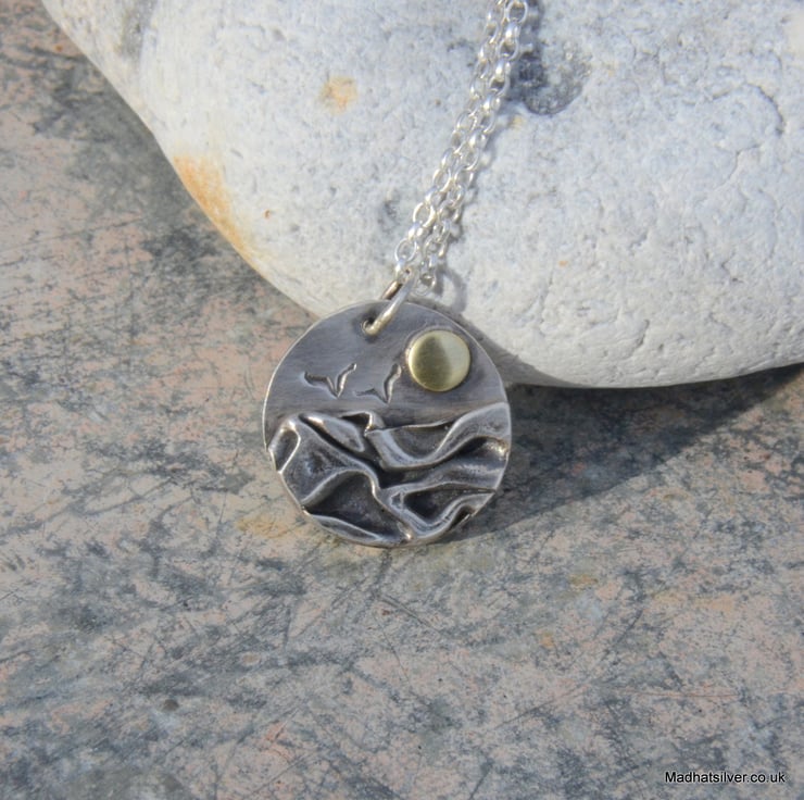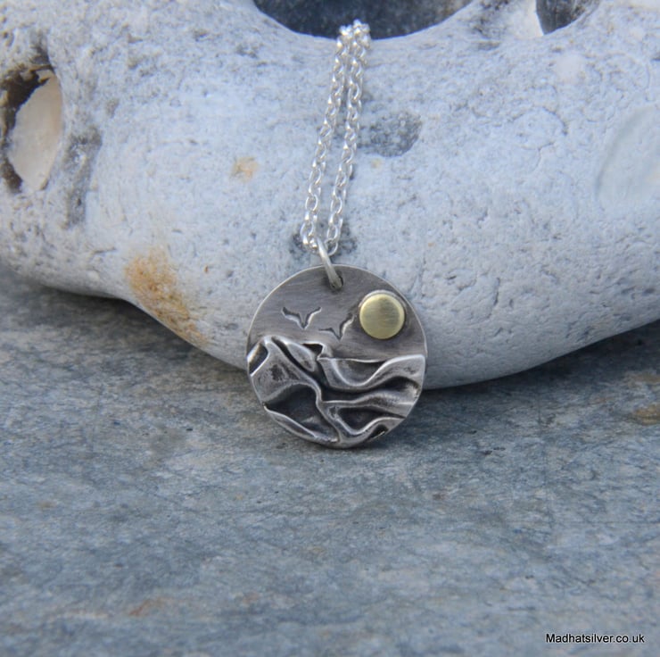 Perfect for anyone who loves the beach, this pendant is handmade in sterling silver with a layer of folded fine silver to represent the sea. It has a tiny brass sun rising above the waves and 2 stamped seagulls flying in the breeze. The pendant has been oxidised to give the effect of a hazy sky. It measures approx 17mm across and comes complete with a sterling silver belcher chain which fastens with a bolt clasp.