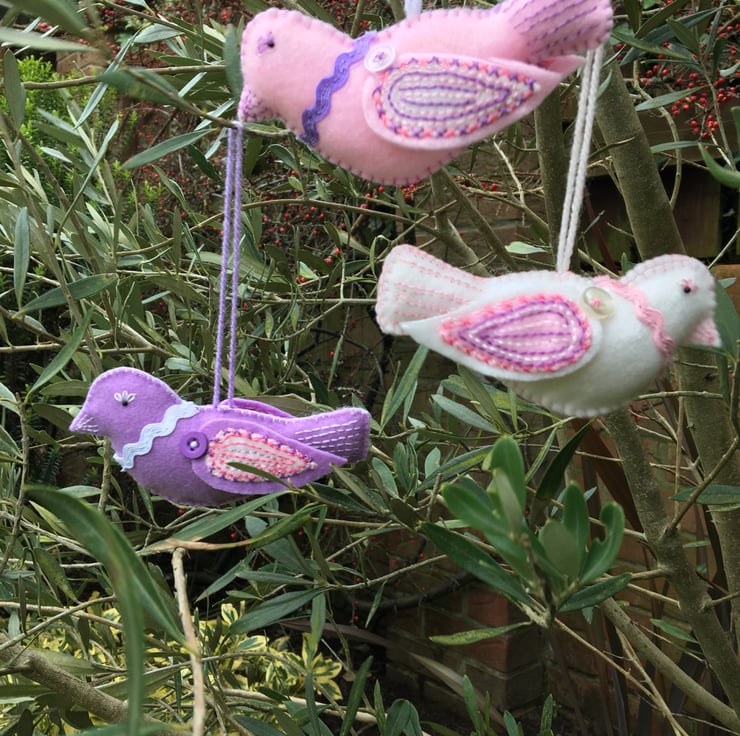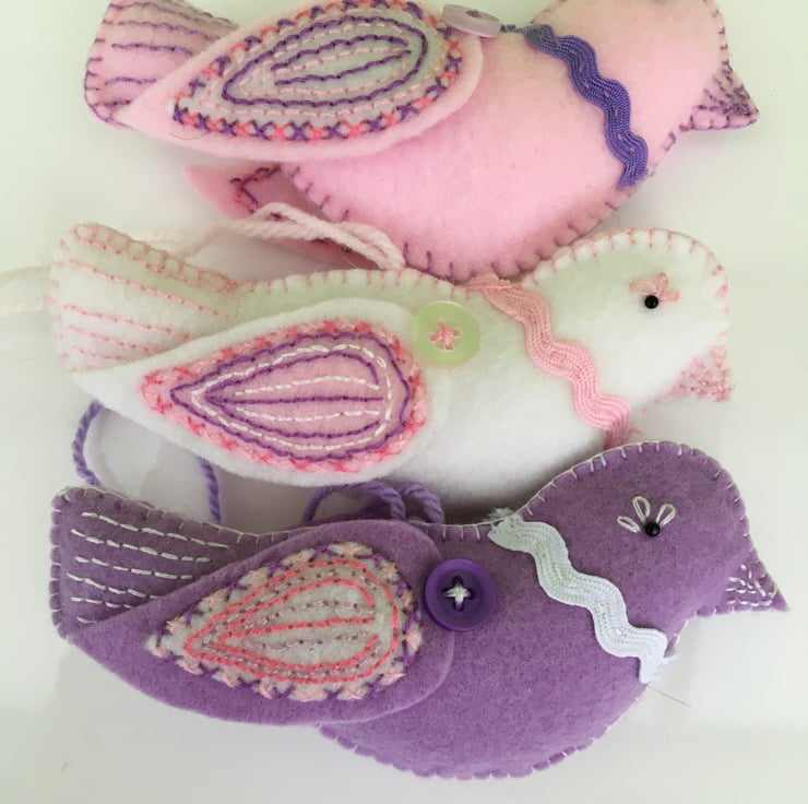 This beautiful trio of felt embroidered birds would look lovely hanging from an Easter tree or given to a loved one as an Easter gift. Handmade in white, soft pink and lilac felt and embellished with embroidery, buttons and ribbon on both sides. Each bird comes complete with it's own hanging loop. Measuring approximately 12.5cm in length.